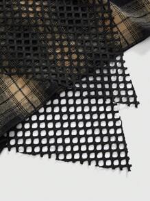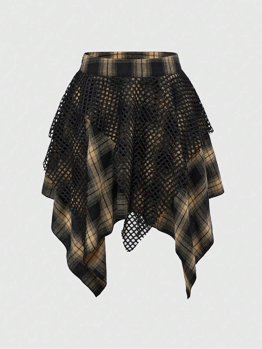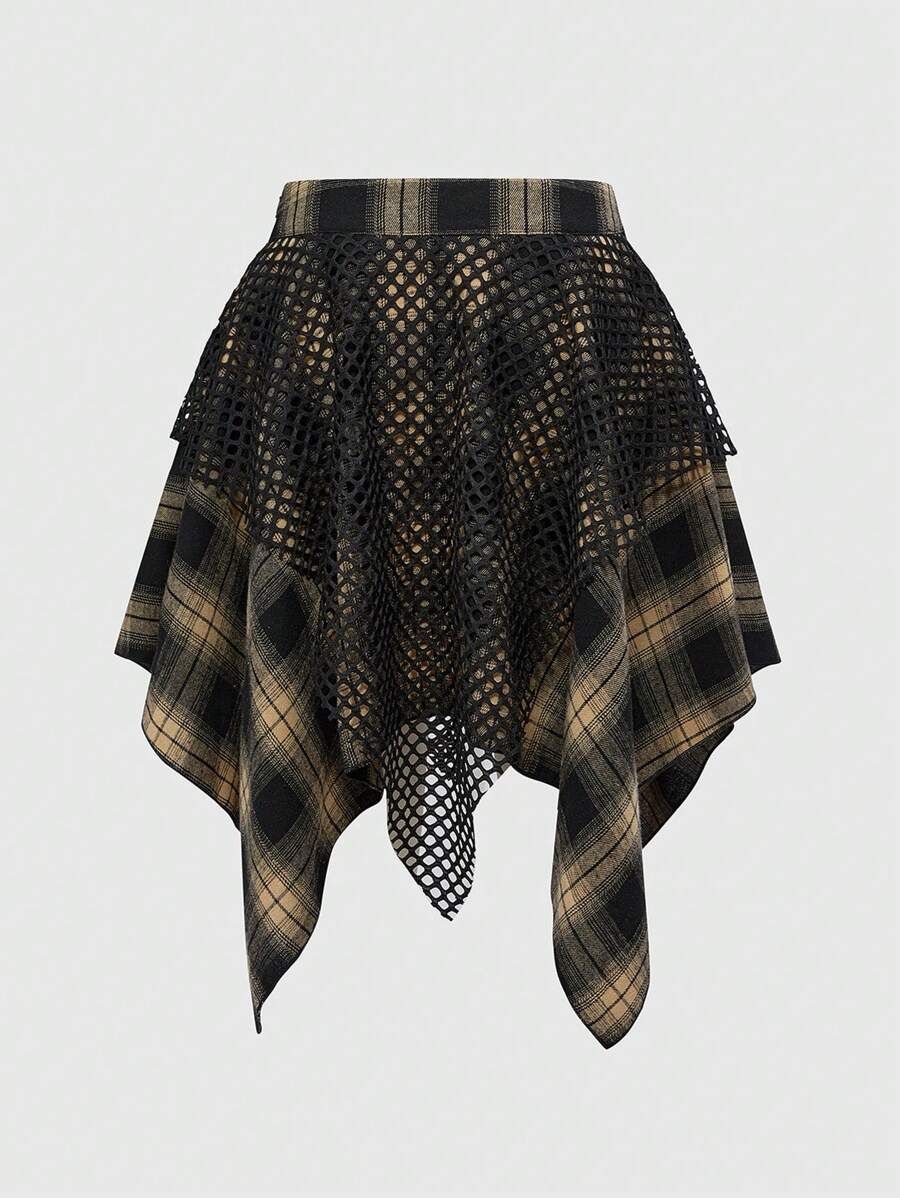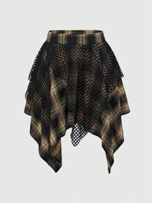 Grunge Punk Women's Asymmetrical Patchwork Plaid Mesh A-Line Mini Skirt, Street Punk Rock Festival Summer