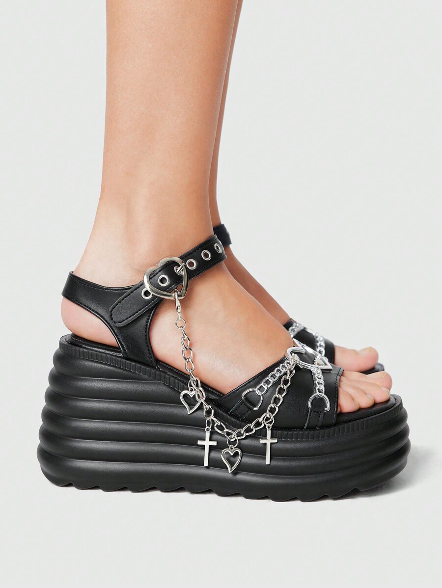 Grunge Punk Women's Cross & Heart Decor Platform Wedge Heel Sandals, Dark Punk Style PU Black Chunky Wedge, Suitable For Daily, Rock, Punk, Campus Wear