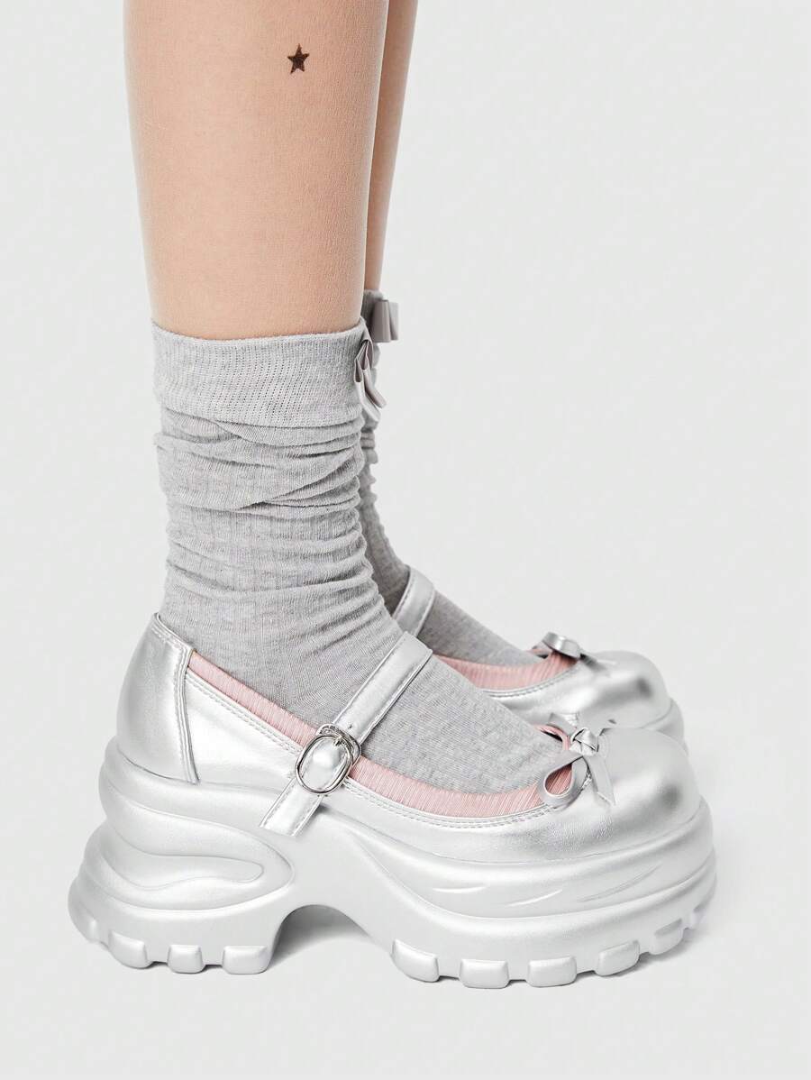 Grunge Punk Women's Cute Bow Round Toe Thick Platform Wedges Shoes, Punk Metallic Style, Casual & School Wear For Christmas And New Year Holiday Vibe Fall And Winter