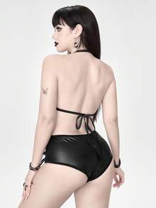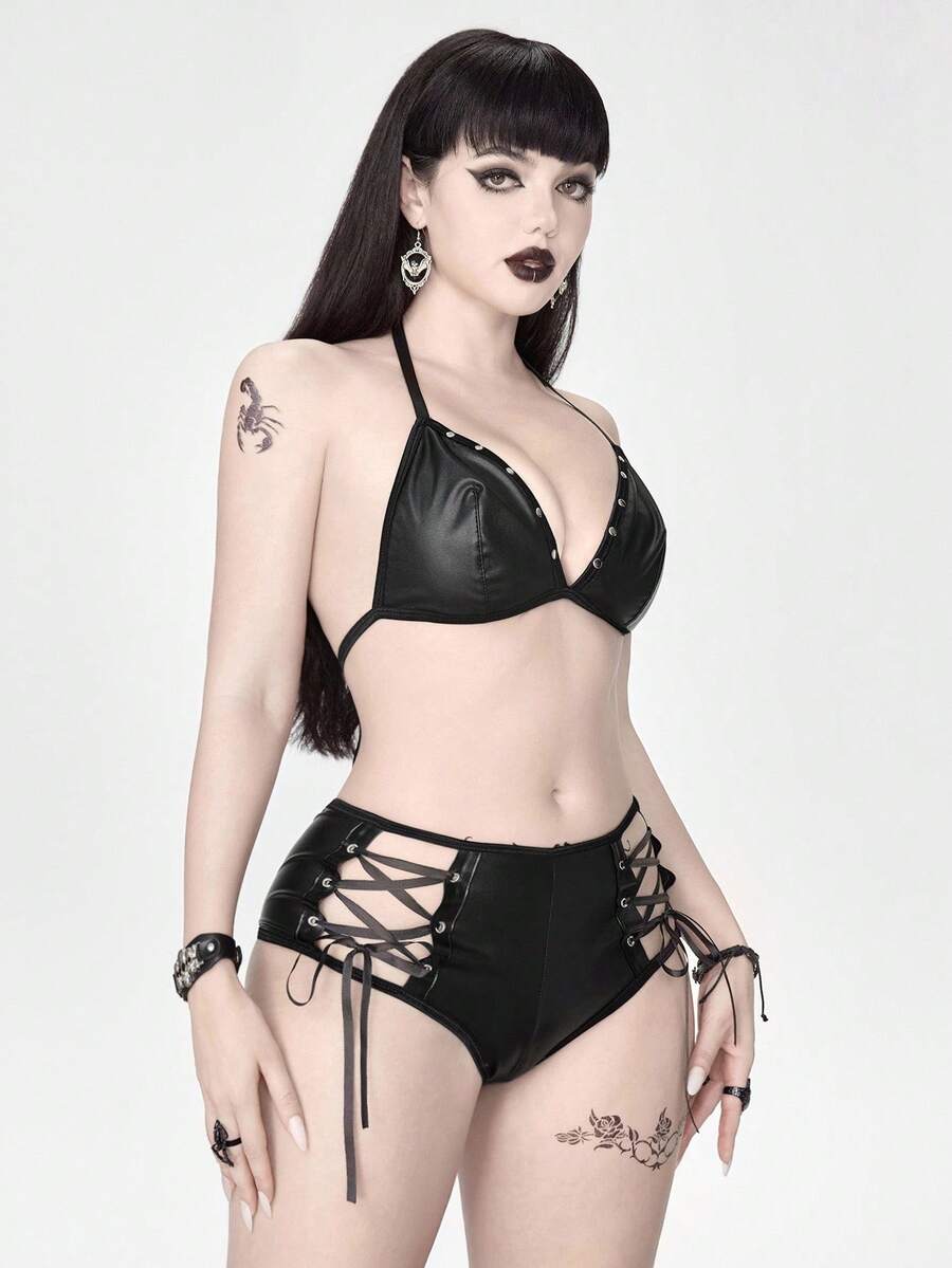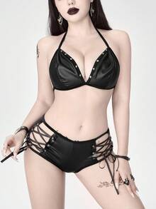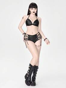 Grunge Punk Women's Dark Punk Eyelet Lace-Up Triangle Bra And Hipster Panty Sexy Lingerie Set