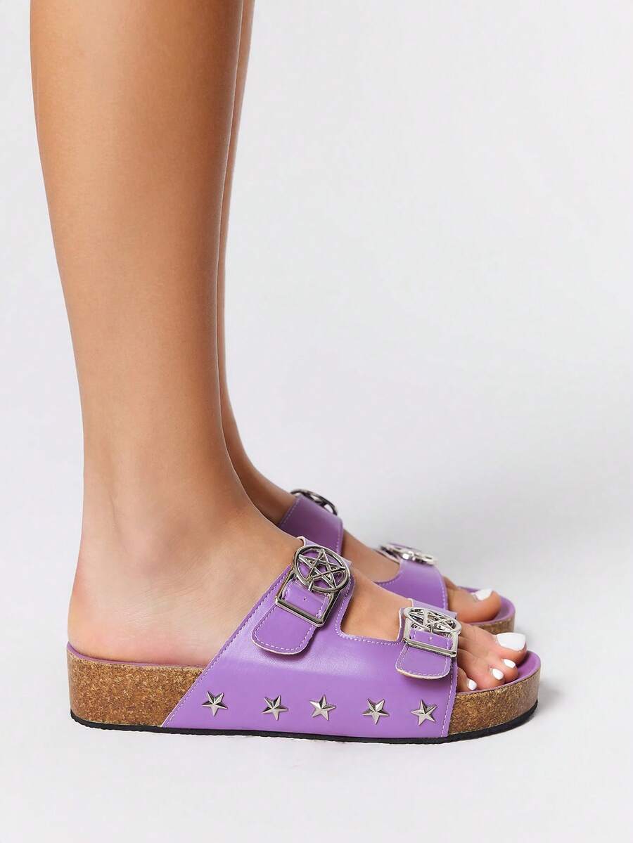 Grunge Punk Women's Dark Punk Rock Style Roman Beach Sandals, Strap Slip-On Holiday Slippers, Star Peep-Toe Wedge Platform Sandals