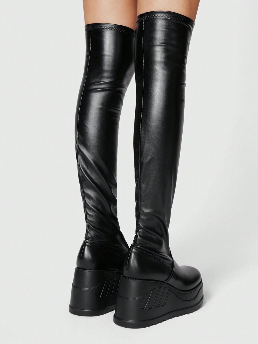 Grunge Punk Women's Elastic Round Toe Thick Platform Dark Punk Goth Style PU Black Thigh High Boots, Suitable For Daily Wear, Dark Rock Punk, Sexy Campus