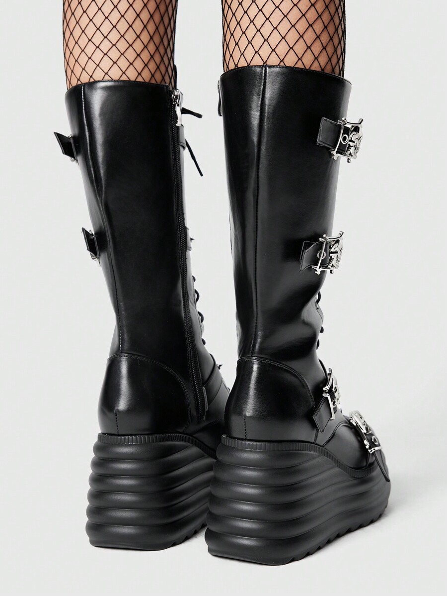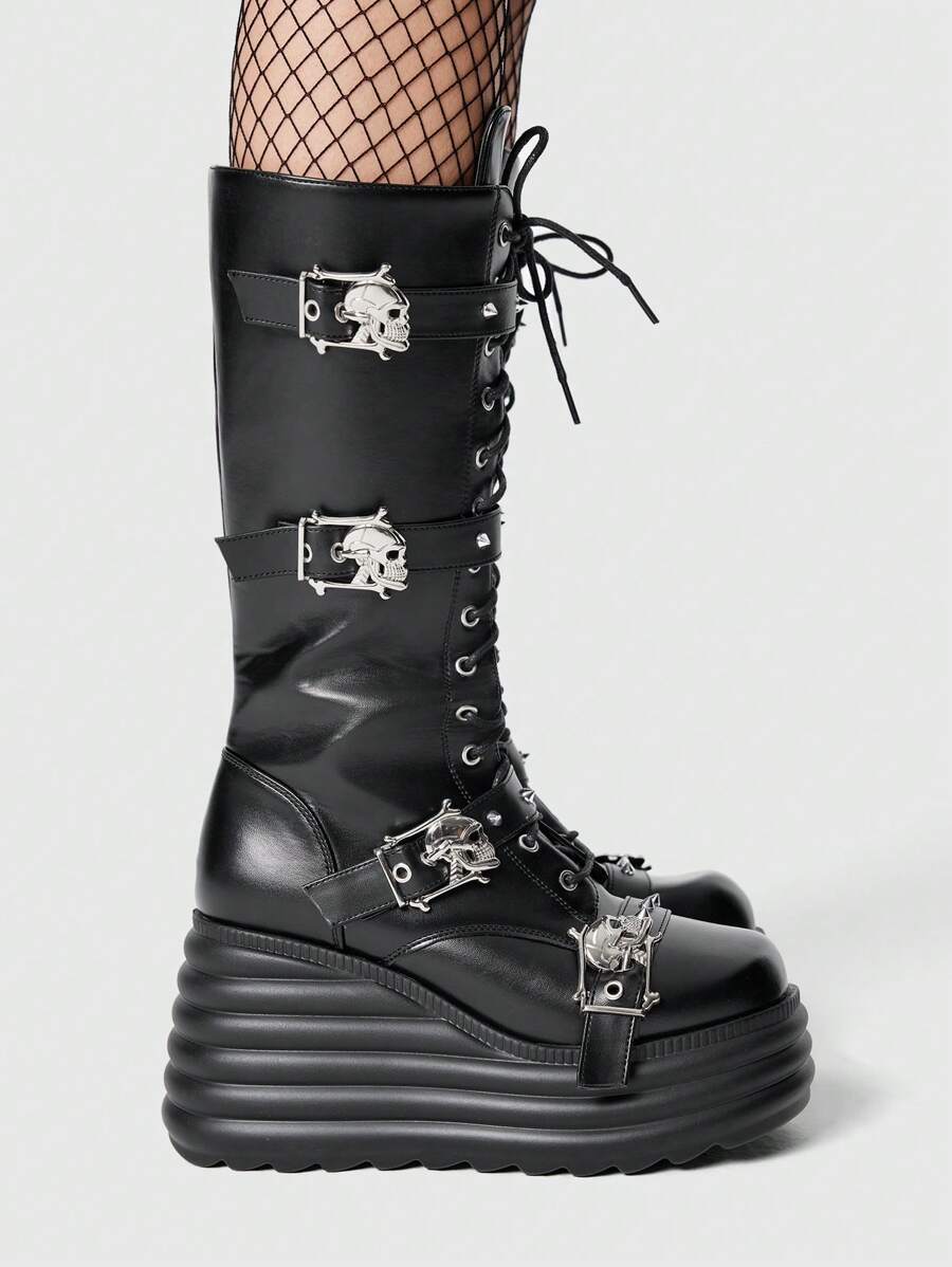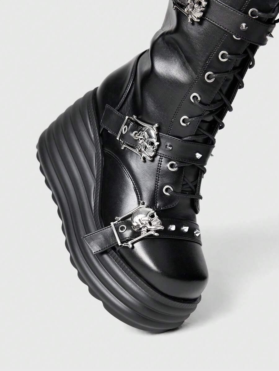 Grunge Punk Women's Multi-Strap Perforated Skull Buckle Round Toe Platform Wedge Heel Punk Ankle Boots, Black Mid-Calf, Everyday Punk Rock Campus Style New Year Holiday