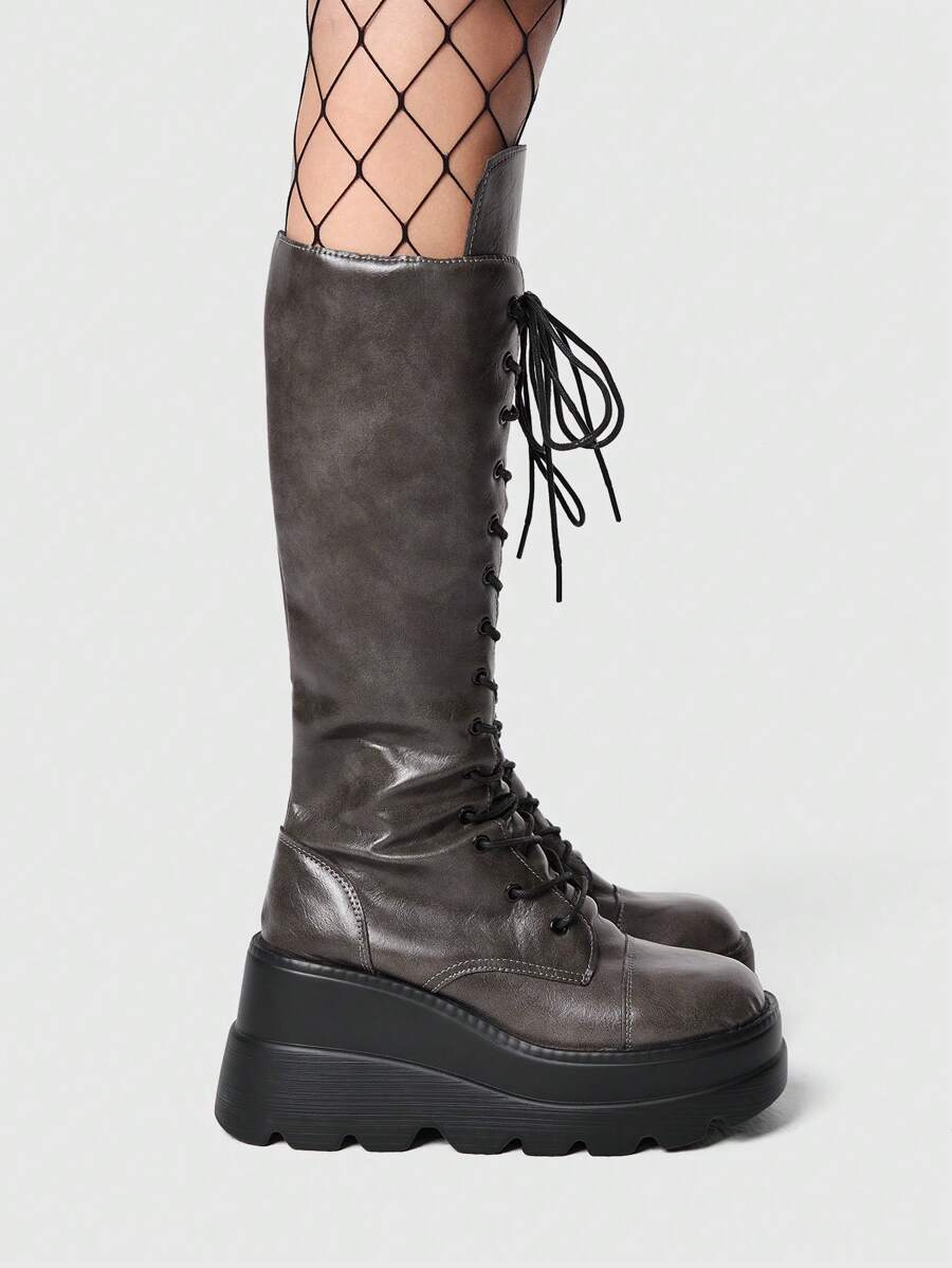 Grunge Punk Women's Patent Leather Over-The-Knee Round Toe Platform Wedge Heel Punk Street High Boots, Shiny Gray, Suitable For Everyday Punk Street Wear For Christmas And New Year Holiday Vibe Fall And Winter