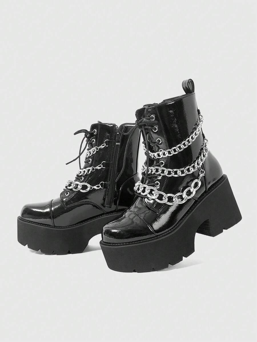 Grunge Punk Women's Punk Style Thick Heel Short Boots, Black Gothic Metal Chain Decor, Wedge Ankle Boots, Comfortable Combat Boots