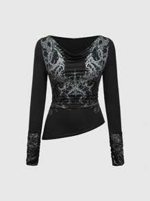 Grunge Punk Y2K Draped Neck Lace Cuff Vintage Print Tight Fitted T-Shirt For Women