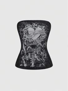 Grunge Punk Y2K Grunge Sexy Crop Top With Rhinestone Heart & Rose Print For Women