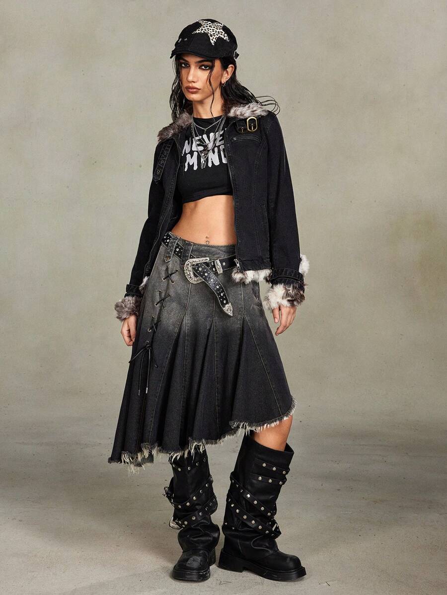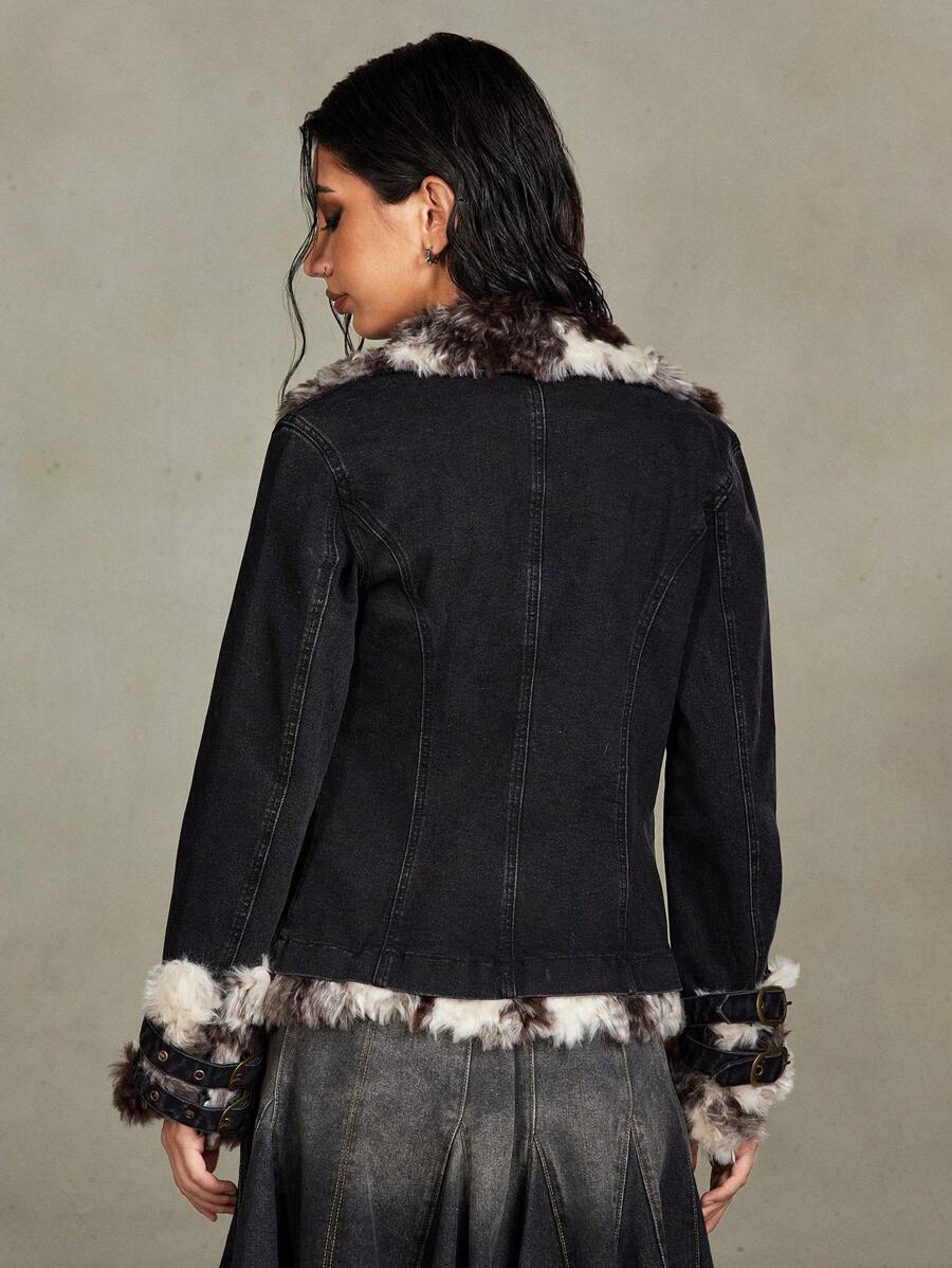 Grunge Punk Y2K Retro Sexy Collar Stitched Button Embellished Women Denim Jacket With Detachable Fur Collar