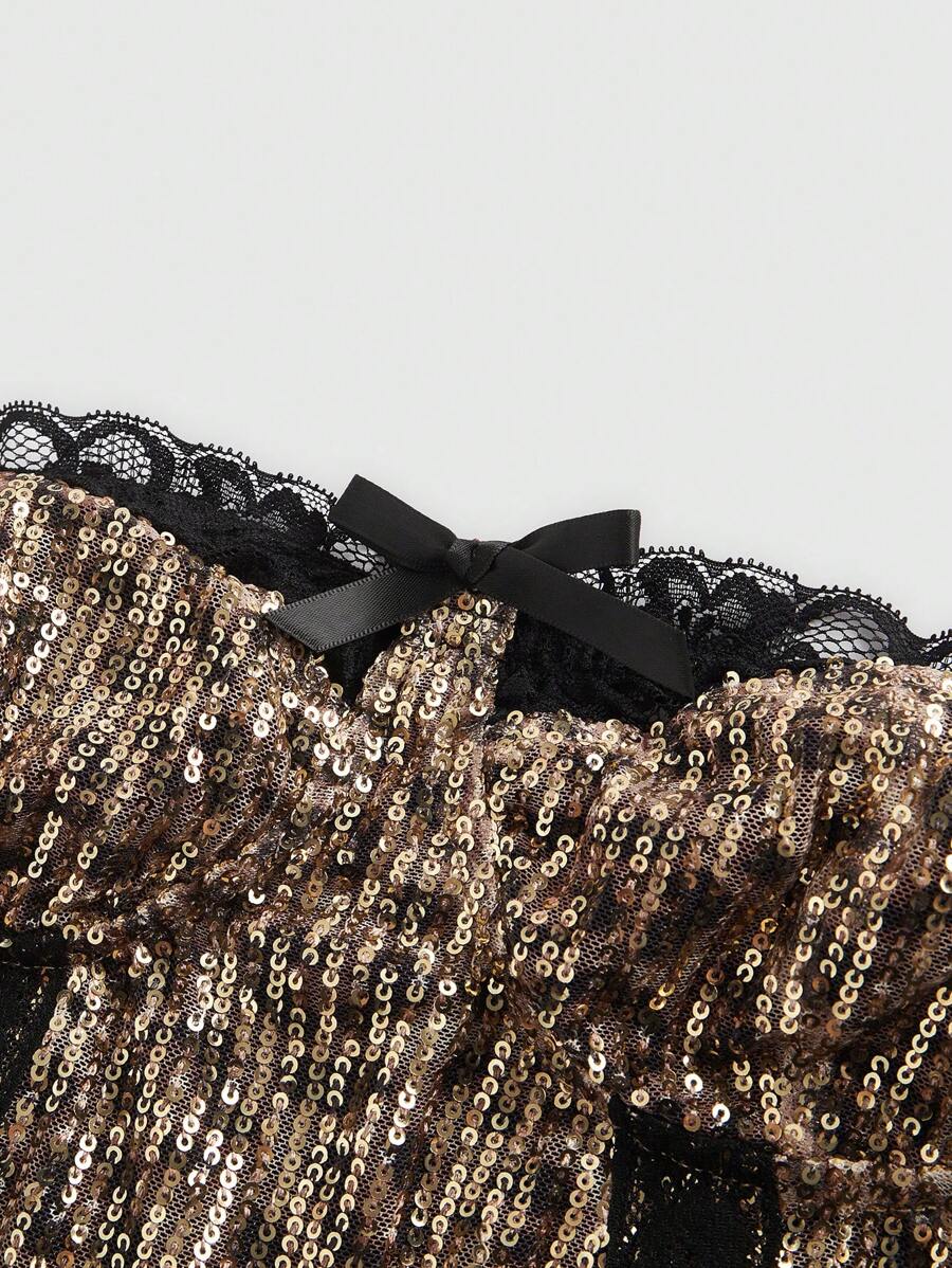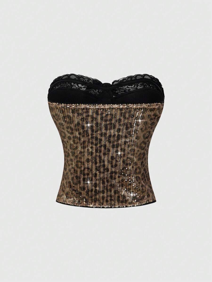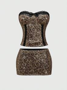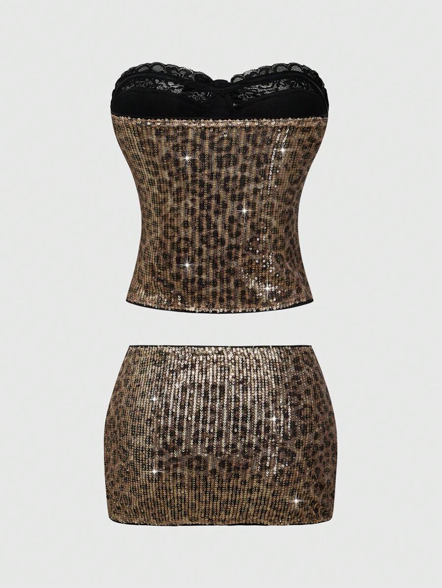 Grunge Punk Y2K Style Leopard Print & Sequin Contrast Lace Trim Bustier Top & Super Low Waist Bodycon Mini Skirt 2 Pieces Set