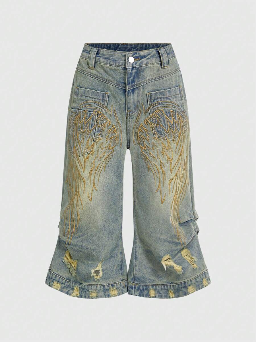 Grunge Punk Y2K Vintage Sexy Angel Wings Embroidered Ruched Distressed Low Waist Women Denim Shorts