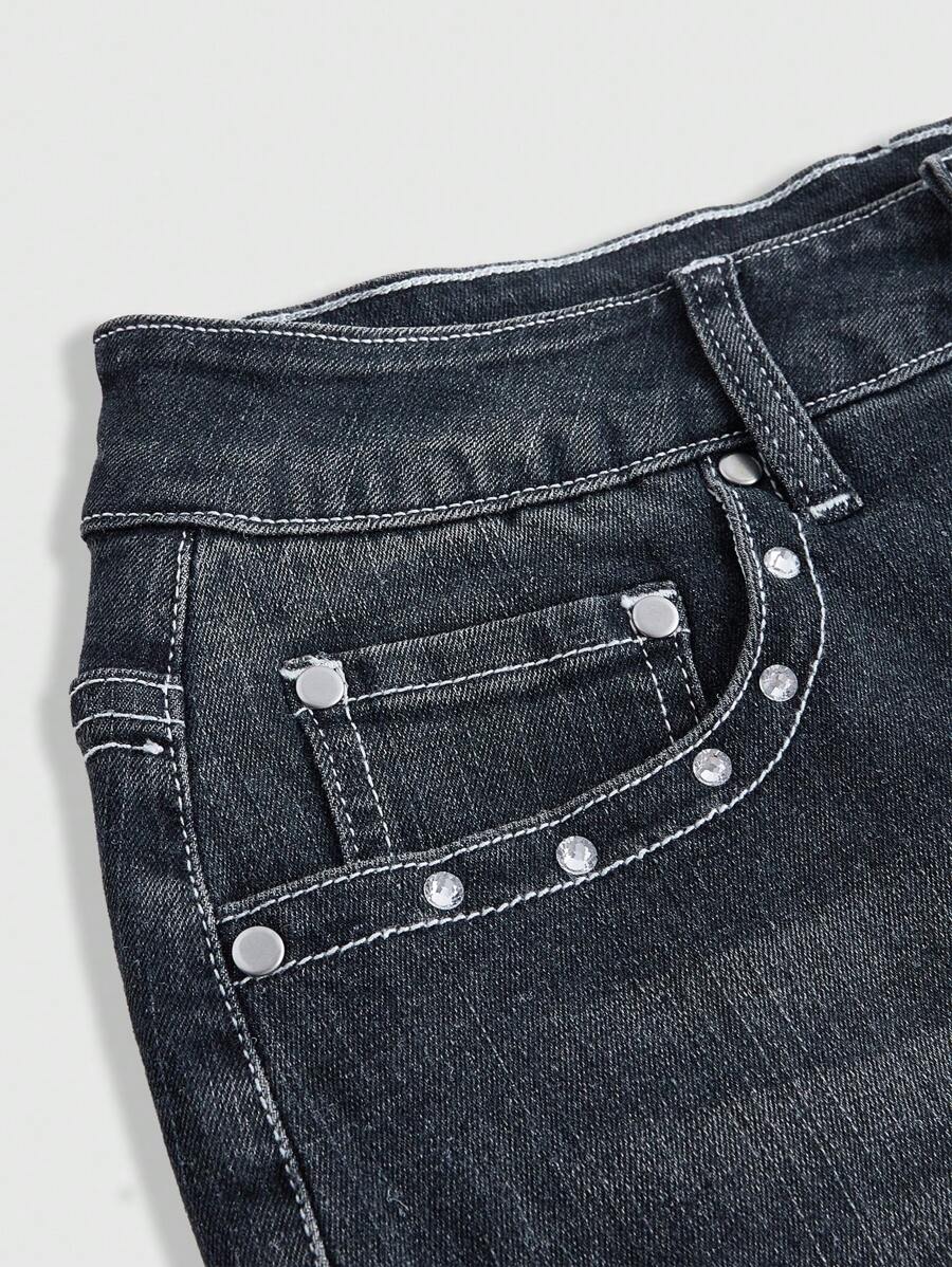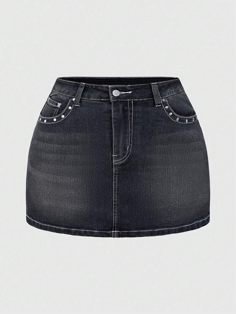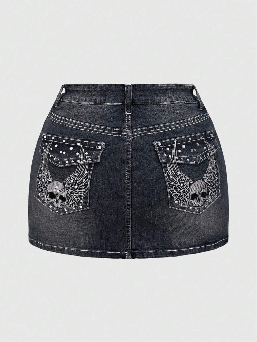 Grunge Punk Y2K Vintage Style Women Tight Mini Denim Skirt With Pockets, Rhinestone Skull & Wings Print, Summer Outfits