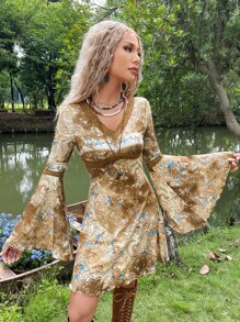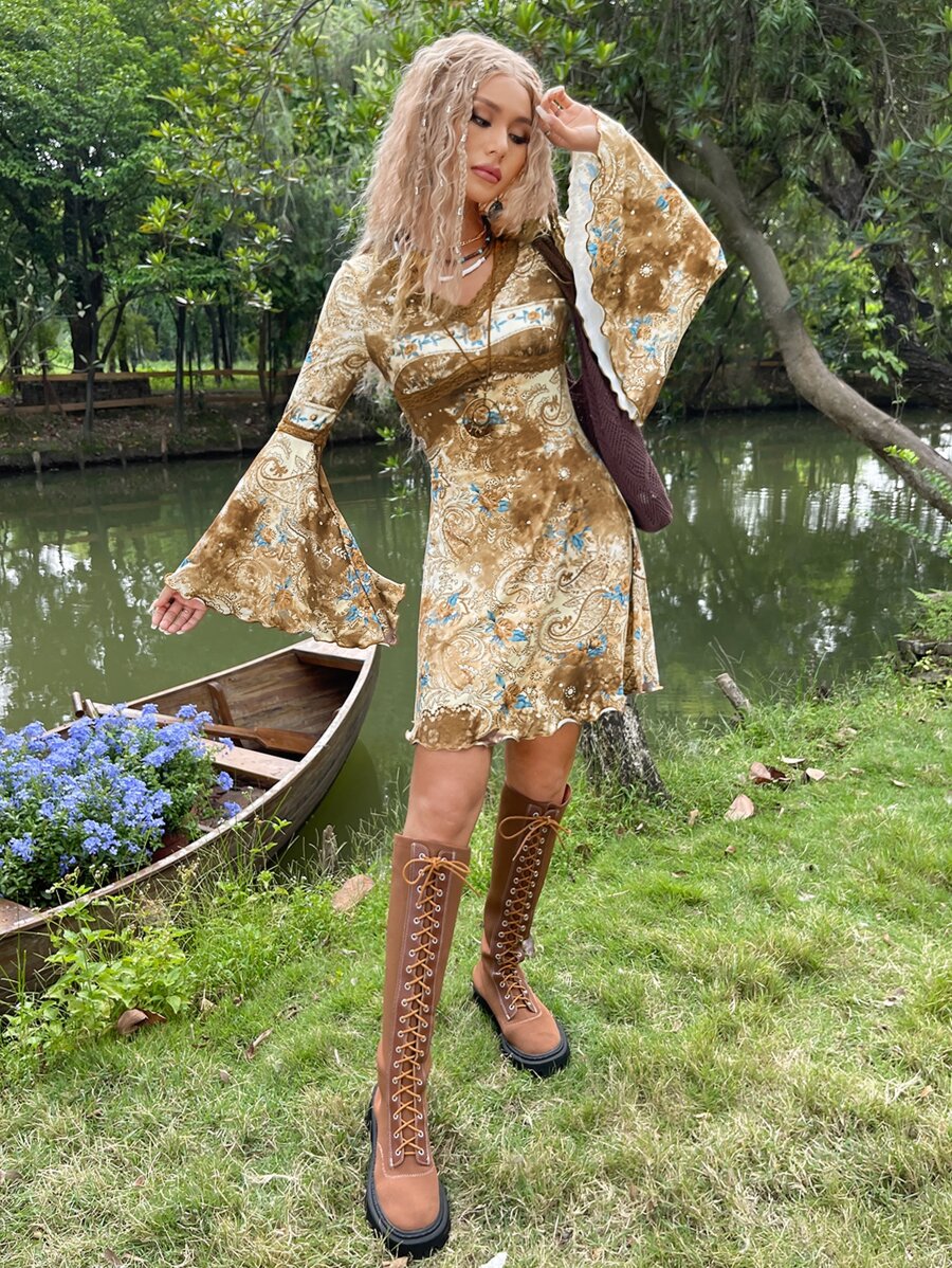 Grunge Tie Dye and Paisley Print Flounce Sleeve Lace Detail Dress