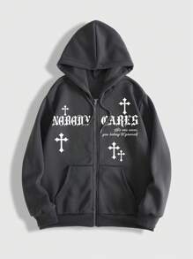 Goth Men Cross Graphic Zip Up Thermal Lined Drawstring Hoodie