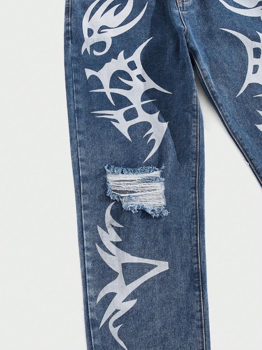 Guys Graphic Print Ripped Frayed Straight Leg Jeans
