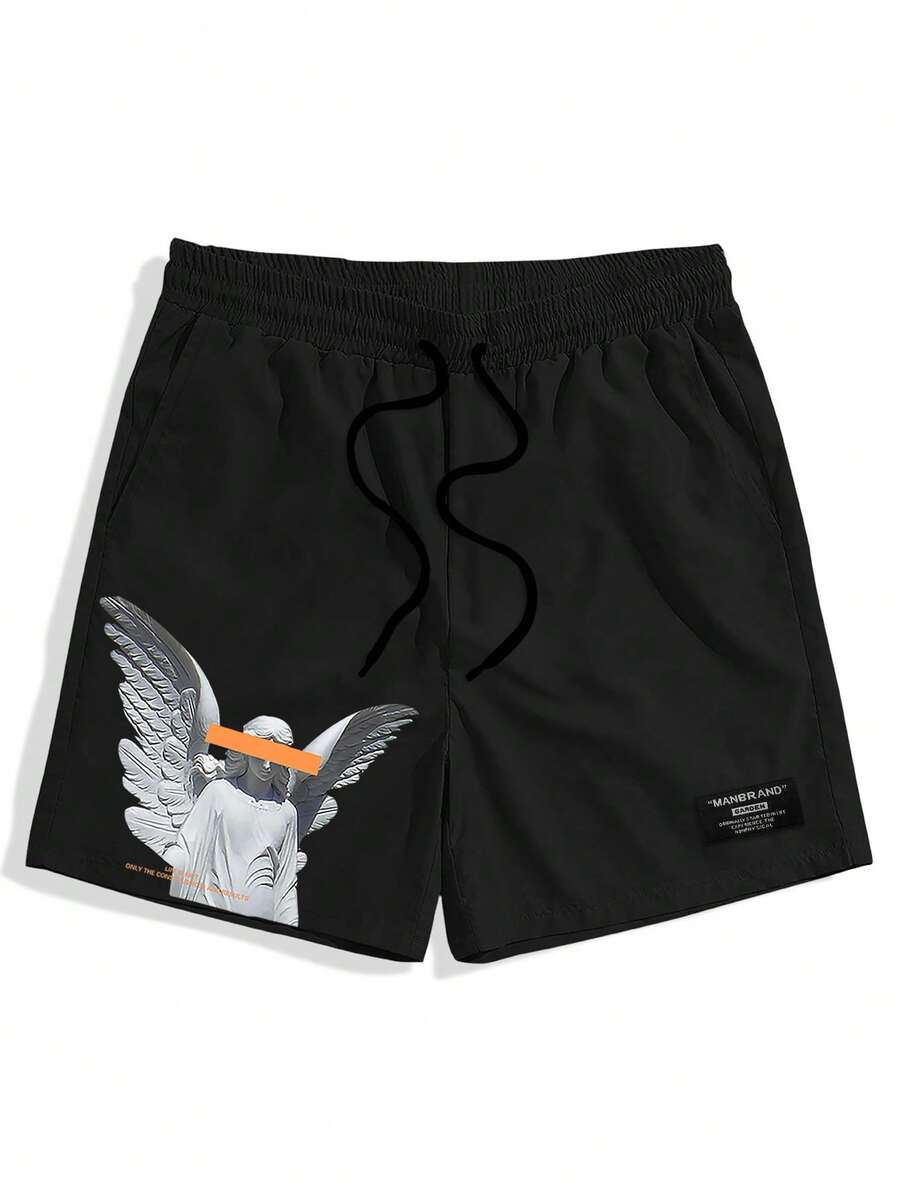 Guys Slogan & Statue Of Liberty Print Drawstring Waist Shorts