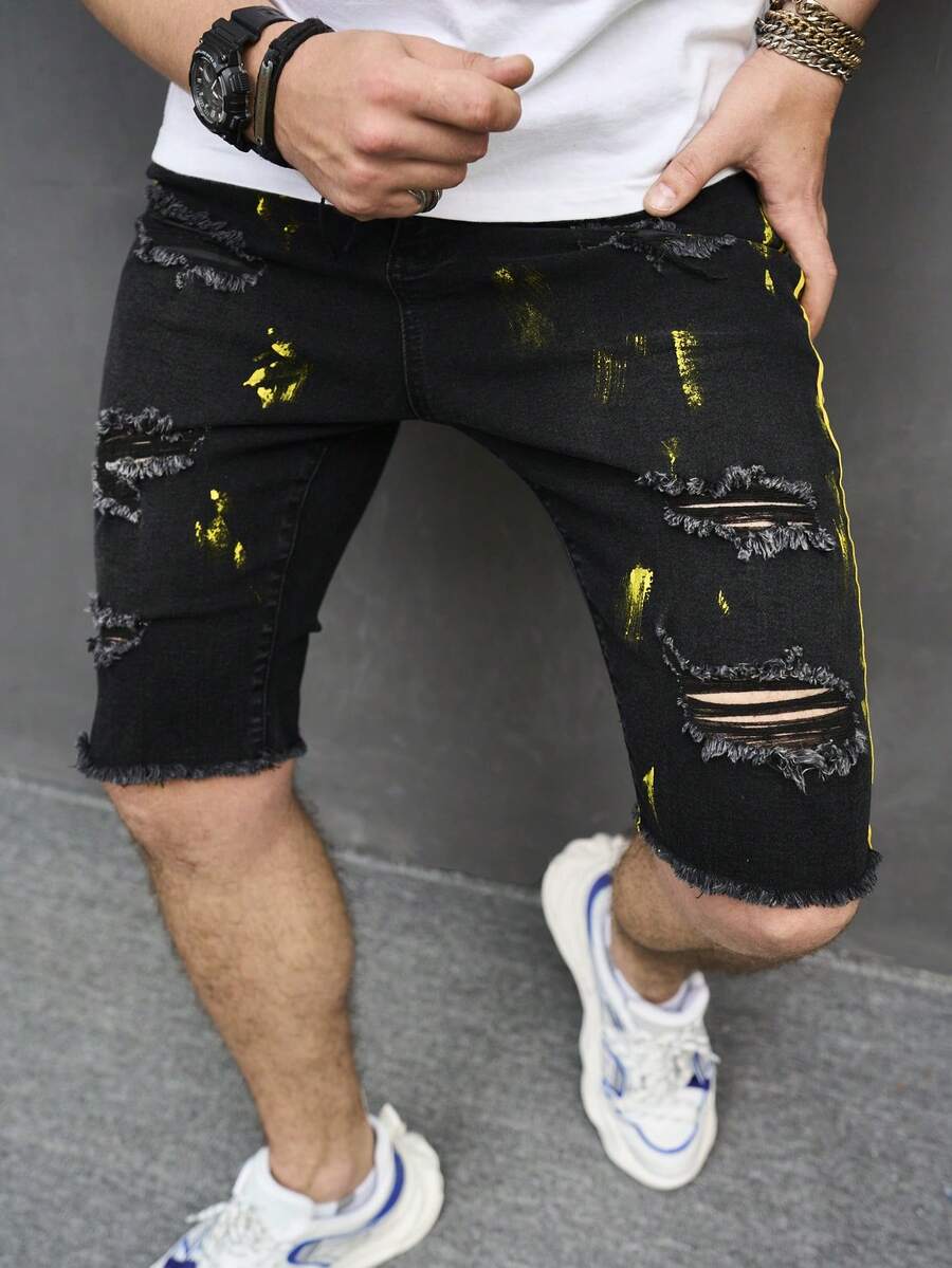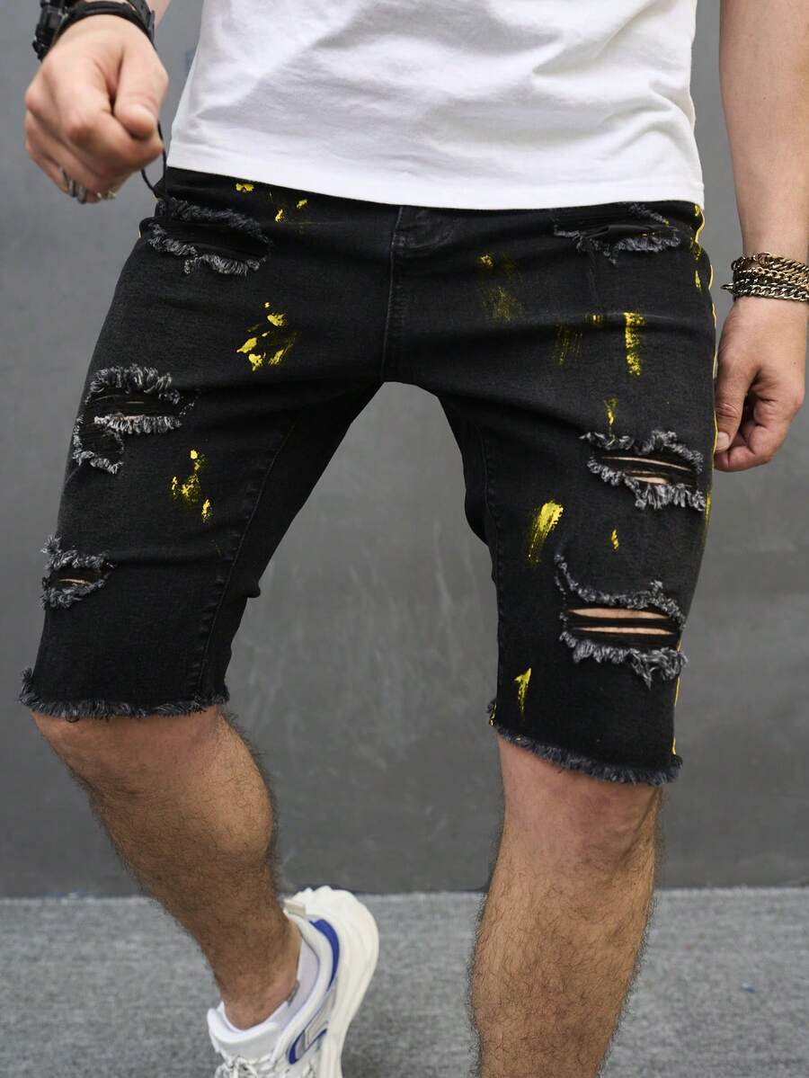Guys Splash Ink Print Ripped Frayed Raw Trim Denim Shorts