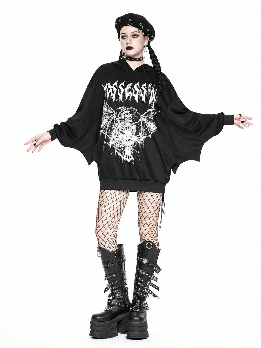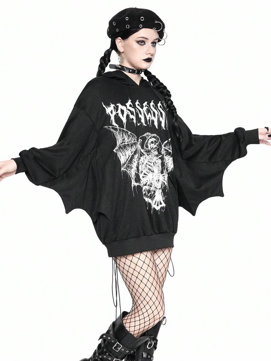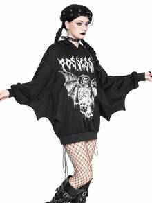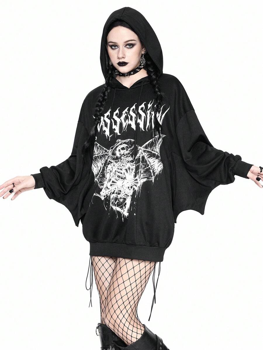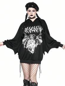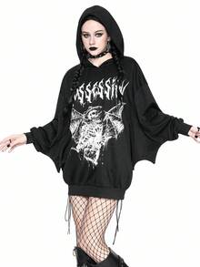 Halloween Women's Gothic Batwing Sleeve Print Hoodie Sweatshirt