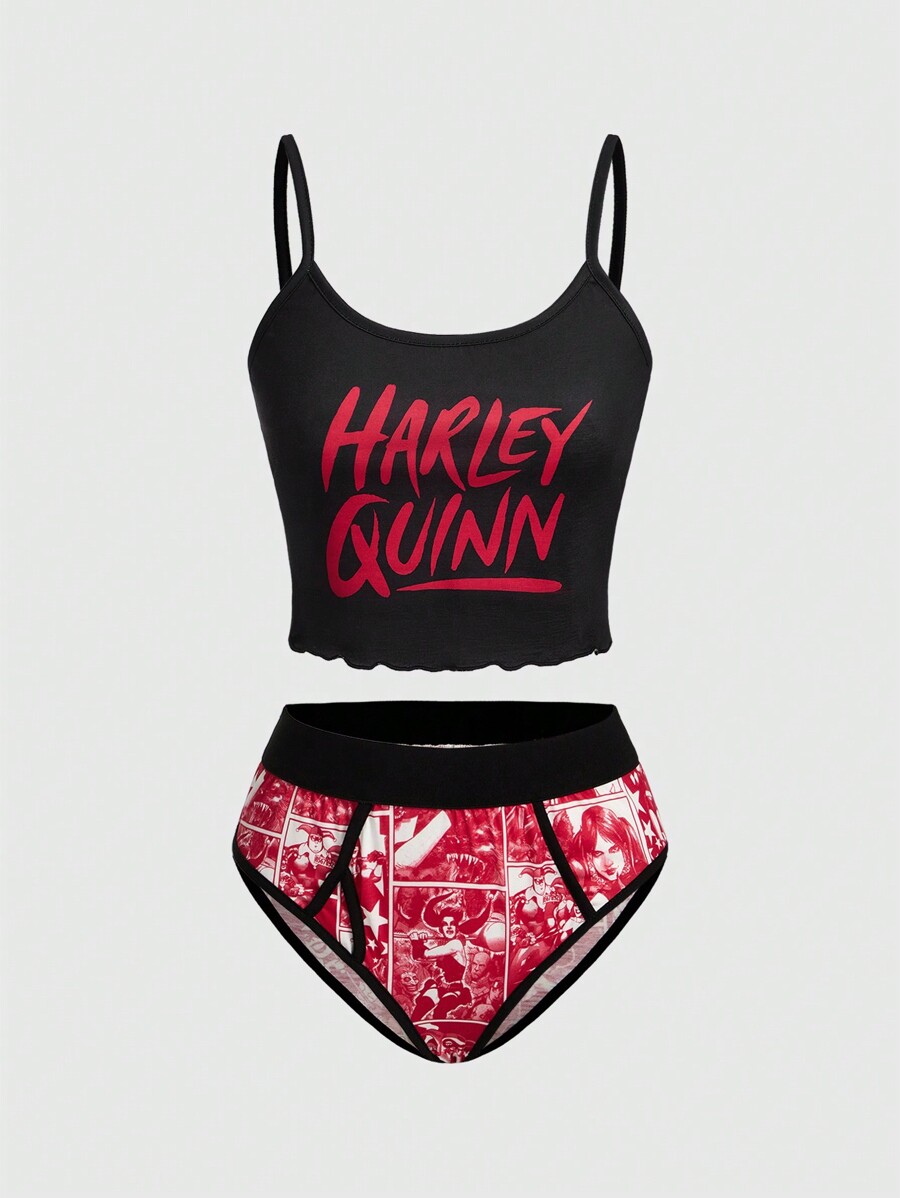 Harley Quinn | ROMWE Harlequin Print Spaghetti Strap Bralette And Color Block Triangle Panties Lingerie Set For Women