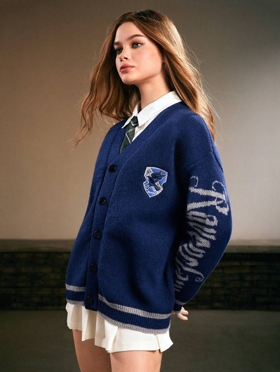 Harry Potter | ROMWE Women's Rauenclaw Letter Embroidered Badge Dropped Shoulder Loose Cardigan Sweater