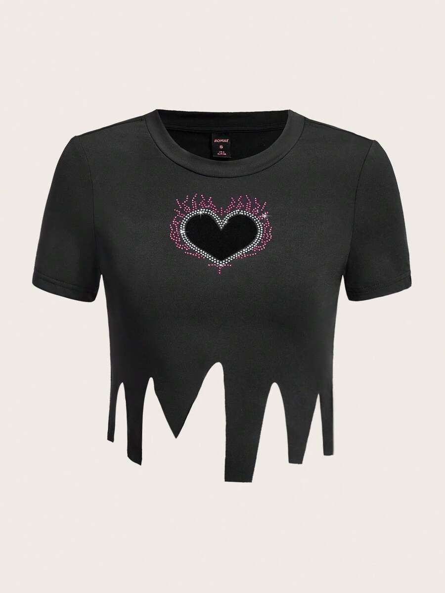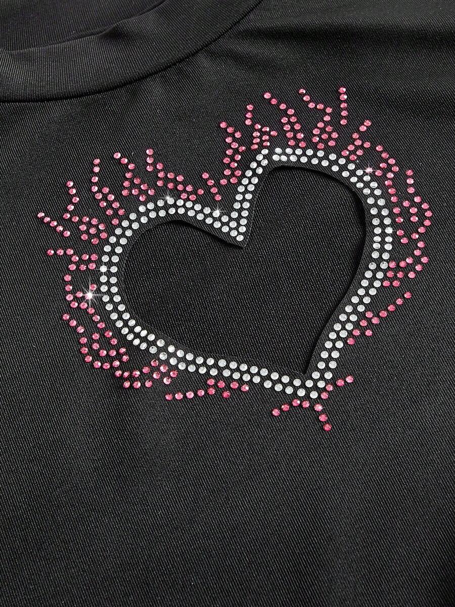 Heart Cut Out Rhinestone Detail Asymmetrical Hem Crop Tee