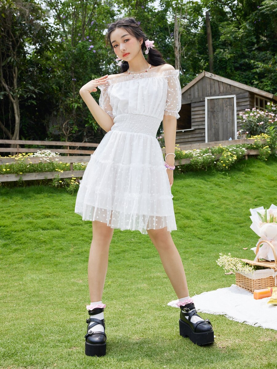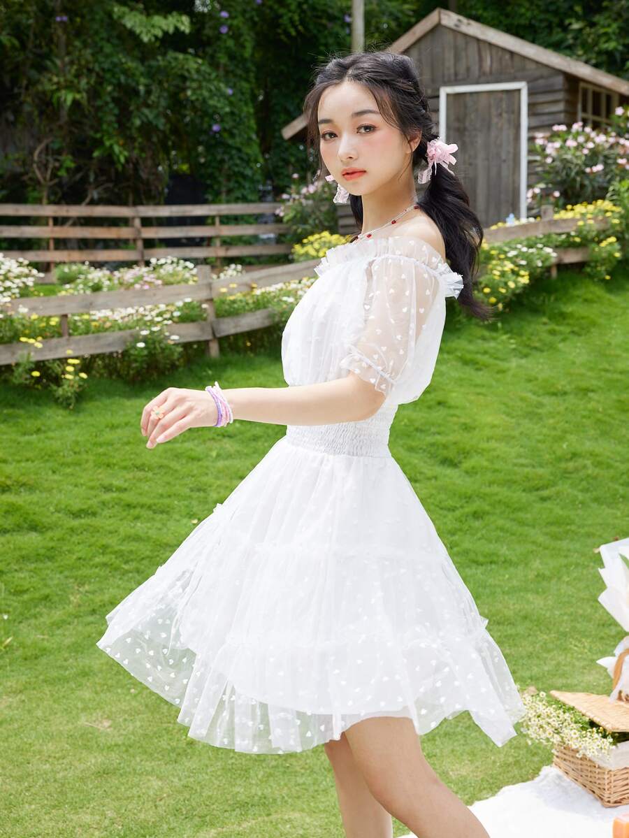 Heart Pattern Off The Shoulder Shirred Mesh Dress