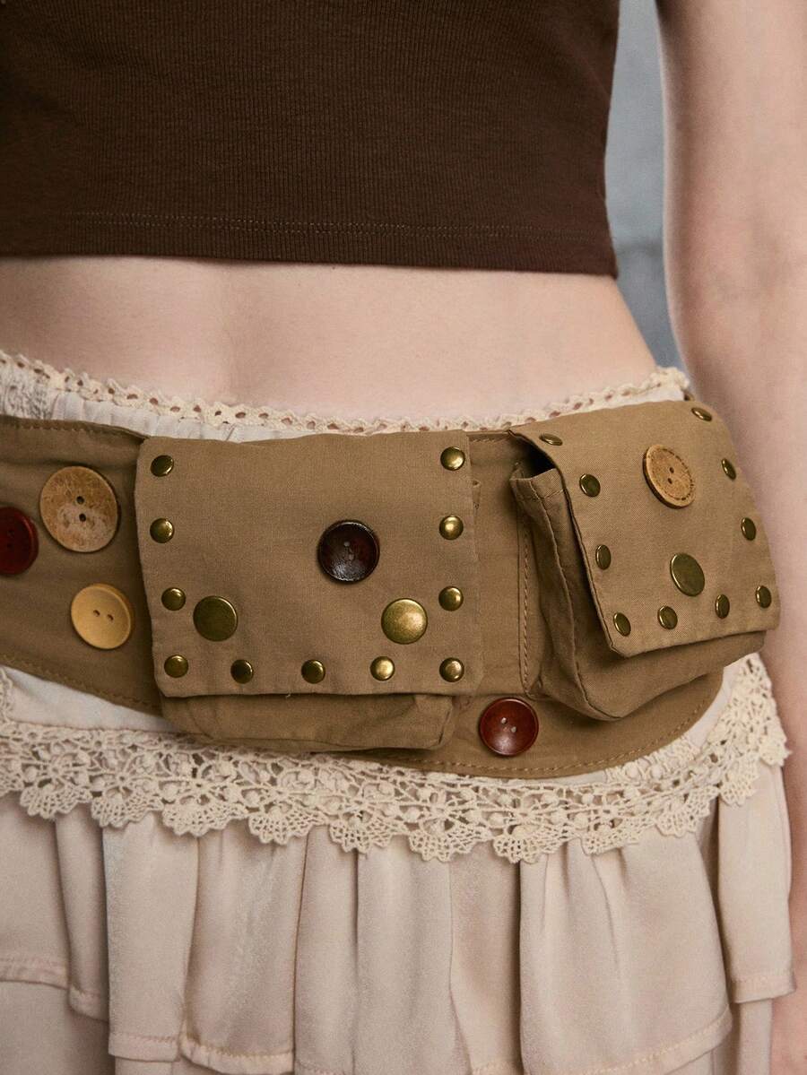 Hippie 1 X Vintage Bohemian Brown Belt Bag With Mixed Buttons And Rivets - Unique Handmade Belt Bag (Button Pattern And Size Random)