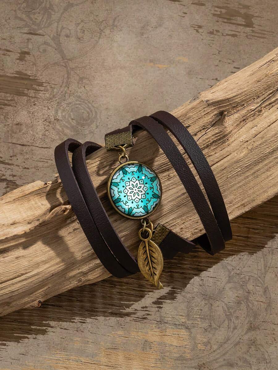 Hippie 1pc Vintage Creative Style Multilayer Braided Pu Leather Chain Bracelet With Round Shaped Gemstone