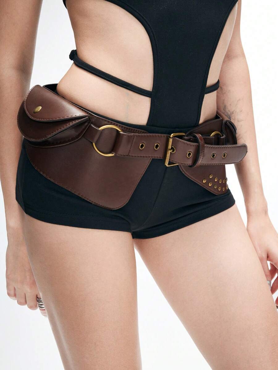 Hippie 1pc Women's Brown Rivet Decorated Boho Western Style Wide Waist Belt, Versatile Accessory For Dress, Jeans, Casual Wear