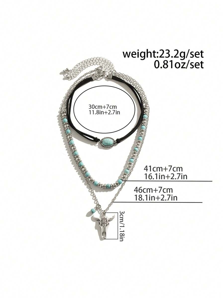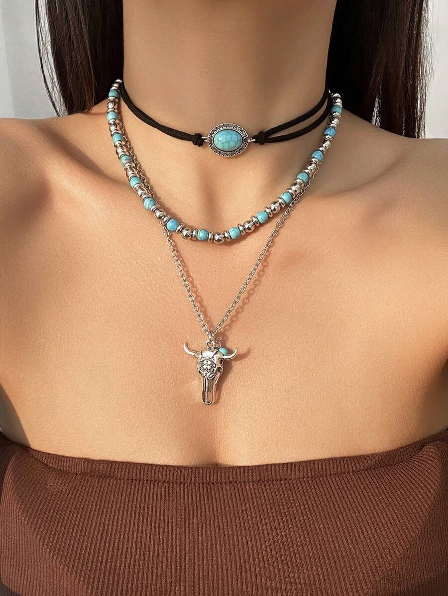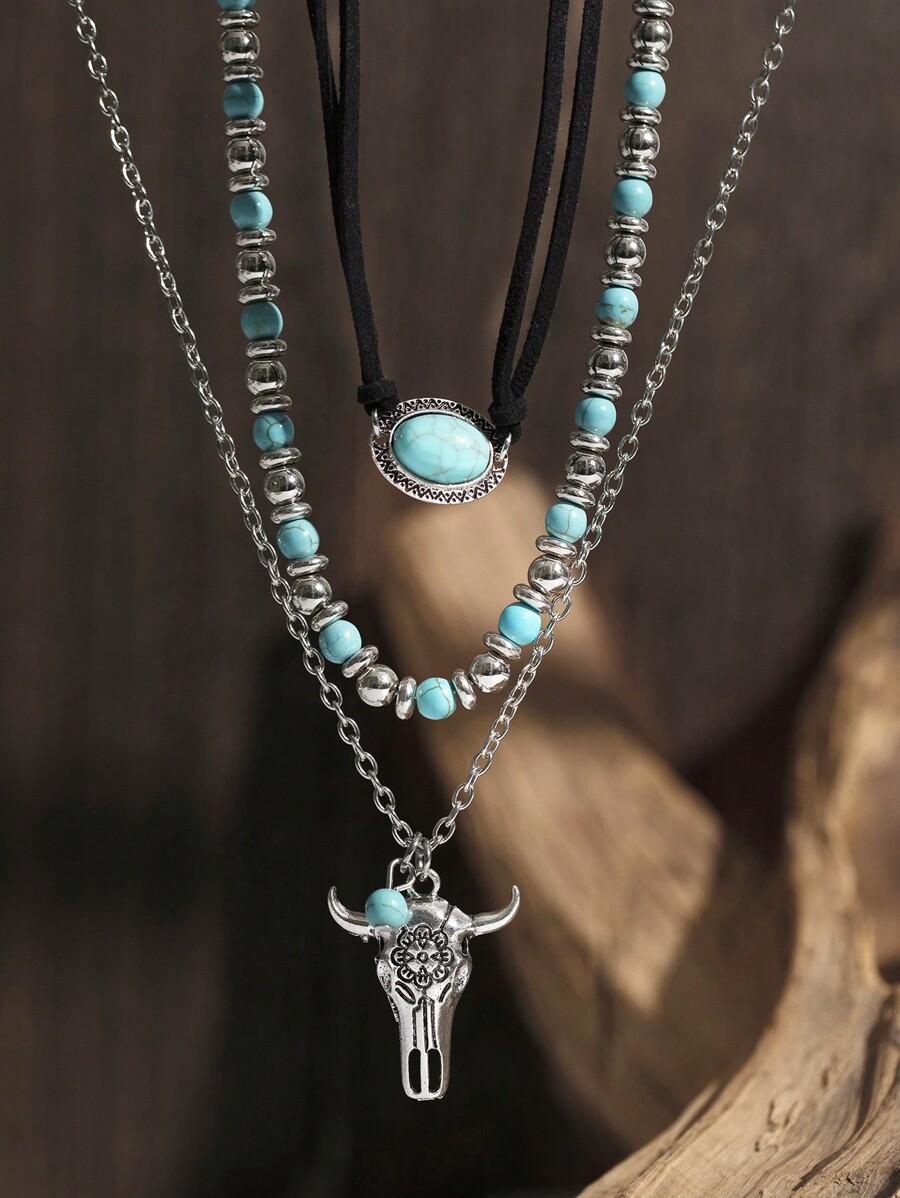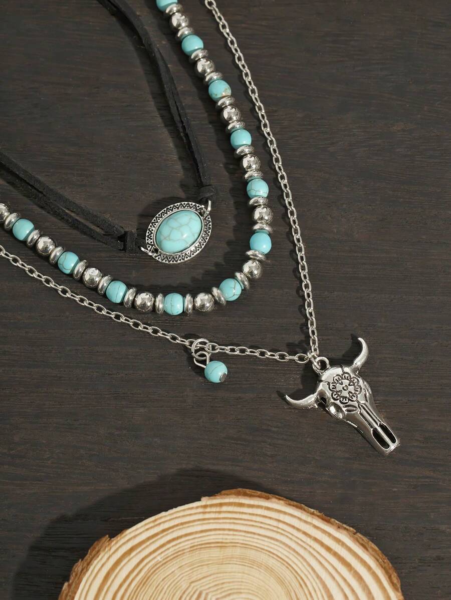 Hippie 3pcs Western Cowboy Style Turquoise Beaded Necklaces With Bull Head Pendant