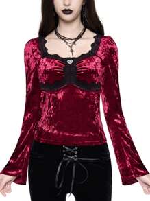 Hippie Elegant Vintage Velvet Lace Sweetheart Collar Fitted Tie-Front Blouse