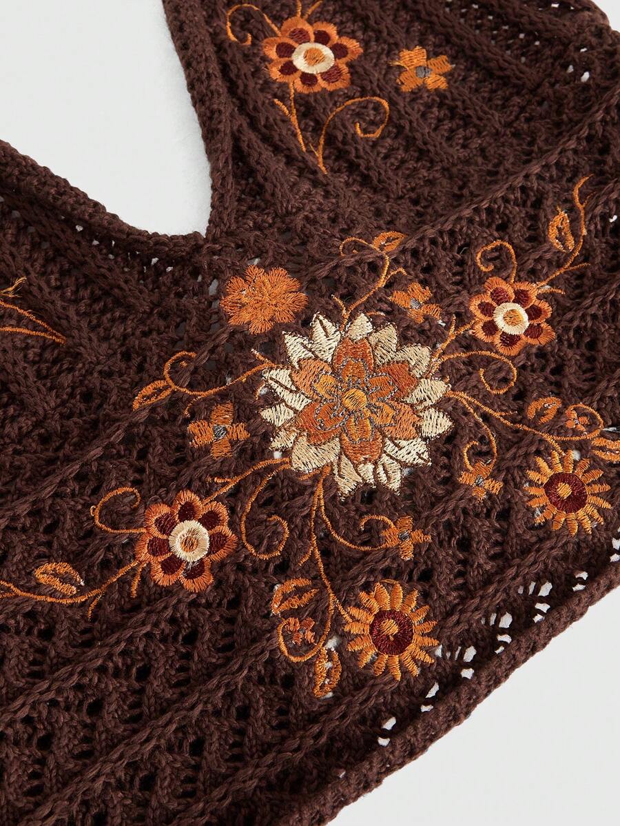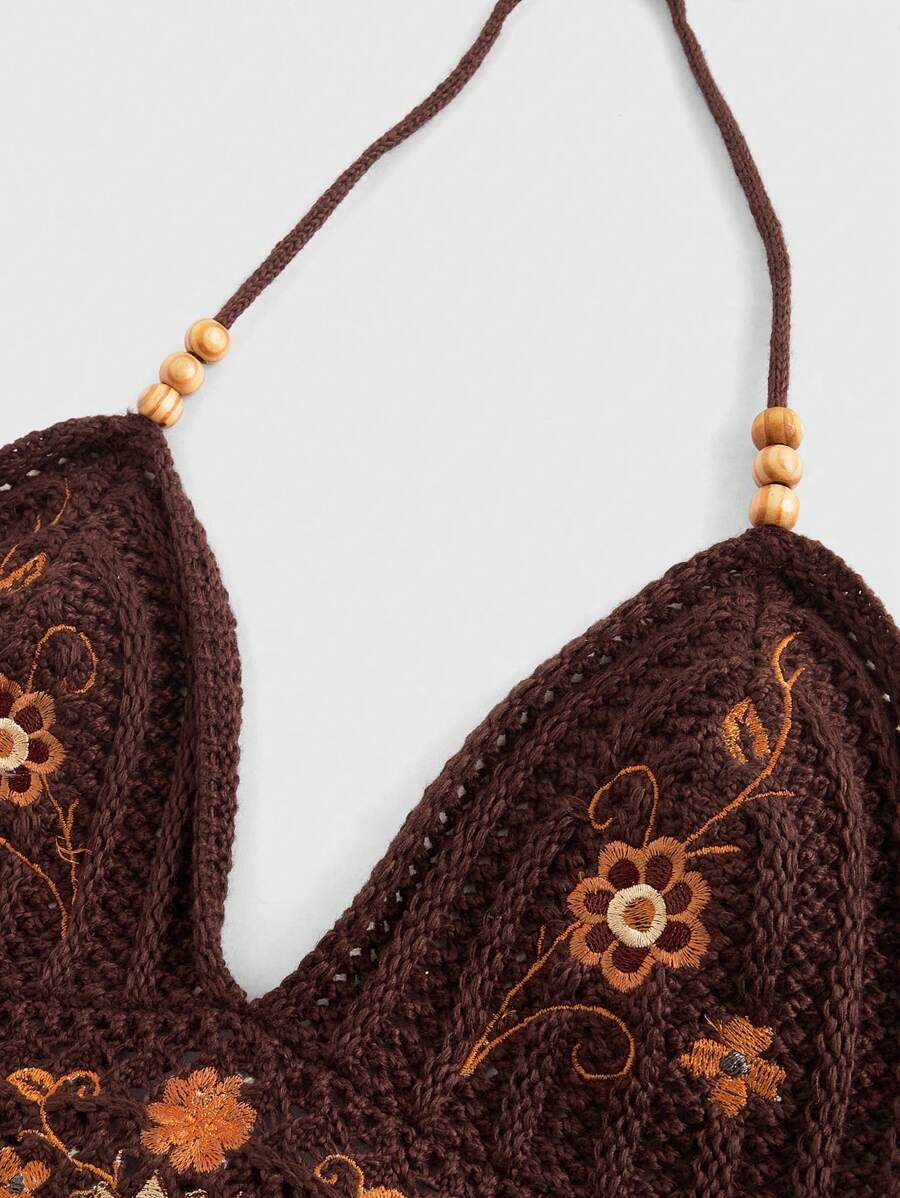 Hippie Flower Embroidered Back Band Beaded Necklace Crochet Knit Top For Summer