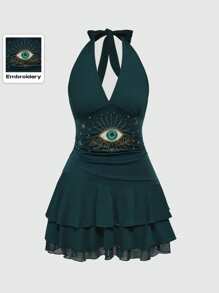 Hippie Eyes Totem Embroidery Women's Halter Neck Multi-Tier Hem Mini Dress
