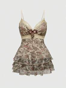 Plus Size Women Vintage Hippie Paisley Print Mini Dress With Ruffle Trim Ribbon Lace