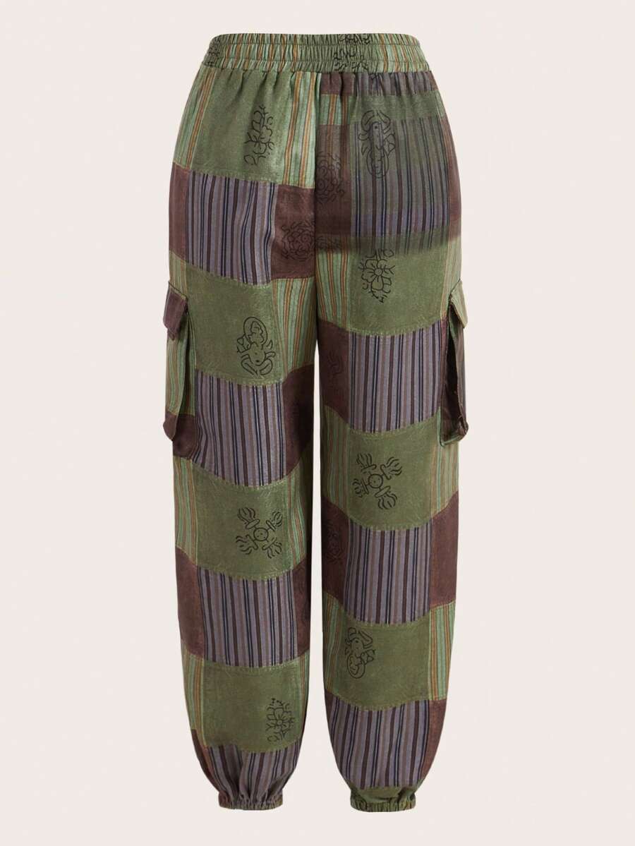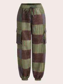 Hippie Striped Print Flap Pocket Drawstring Waist Cargo Pants