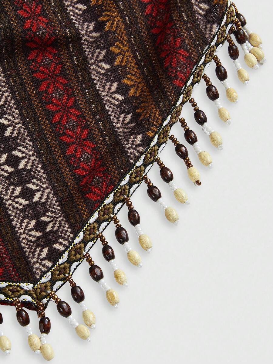 Summer Hippie Retro Western Cowgirl Music Festival Sheer Wooden Beads Tassel Bottom Boho Print Bandeau Top For Women