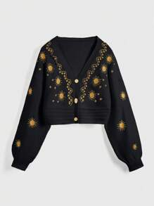 Hippie Women's Casual Sun & Moon Bohemian Embroidery Drop Shoulder Loose Short Lightweight Cardigan