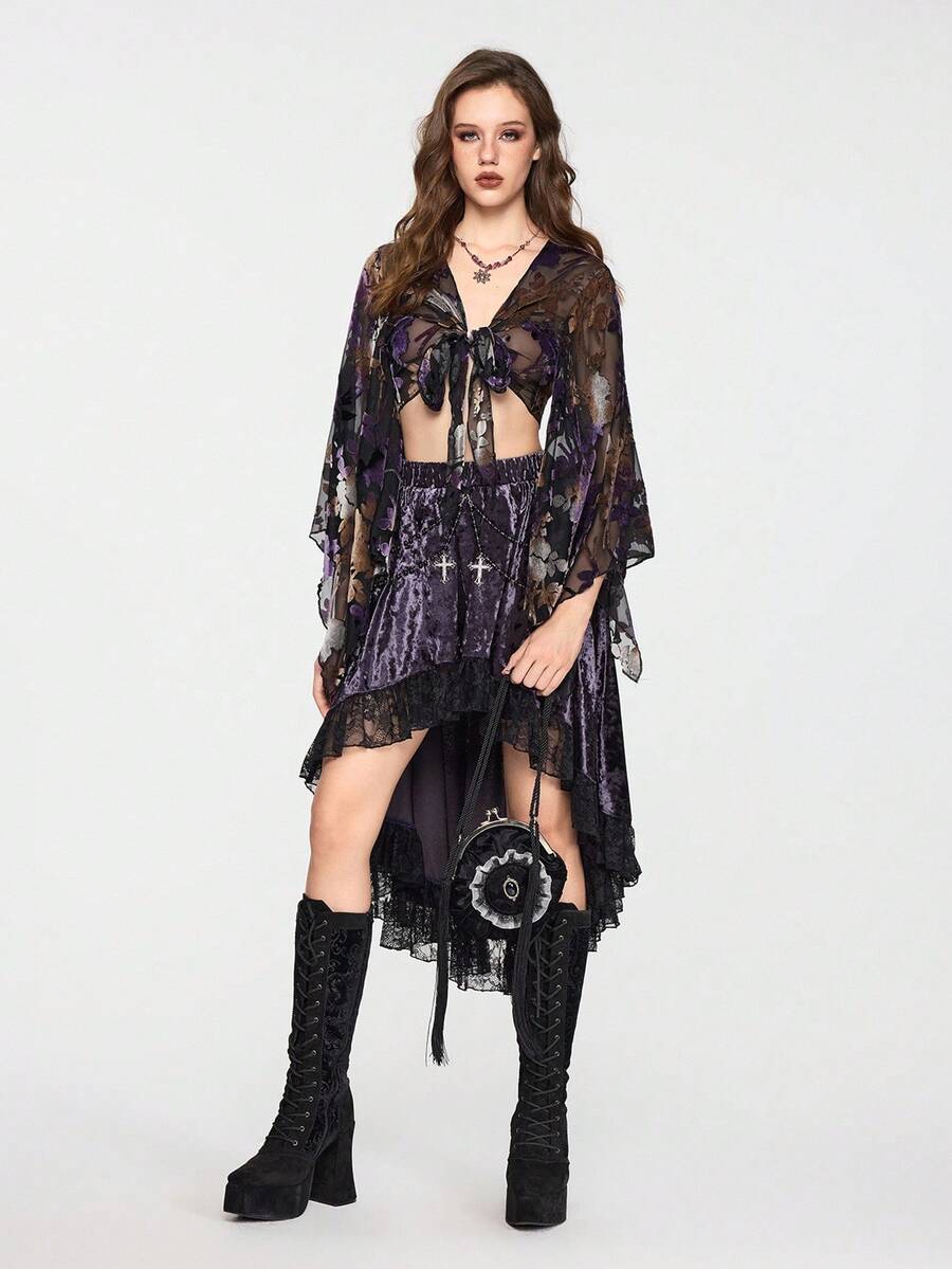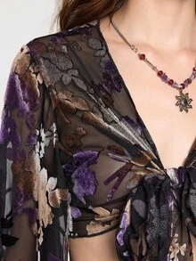 Hippie Women's Floral Flocked Sheer Sexy Dark Luxurious Palace Ruffle Sleeve Blouse