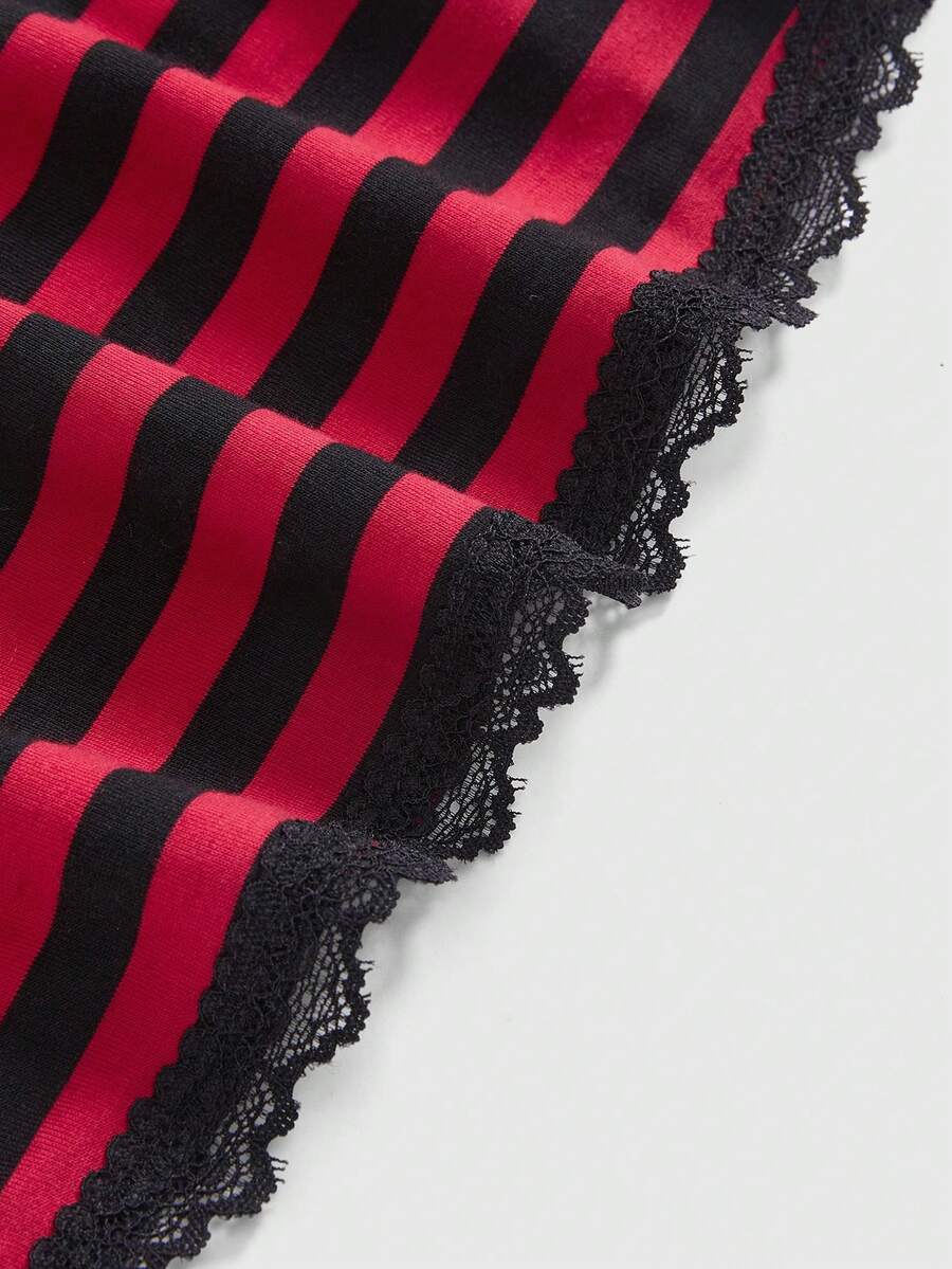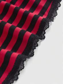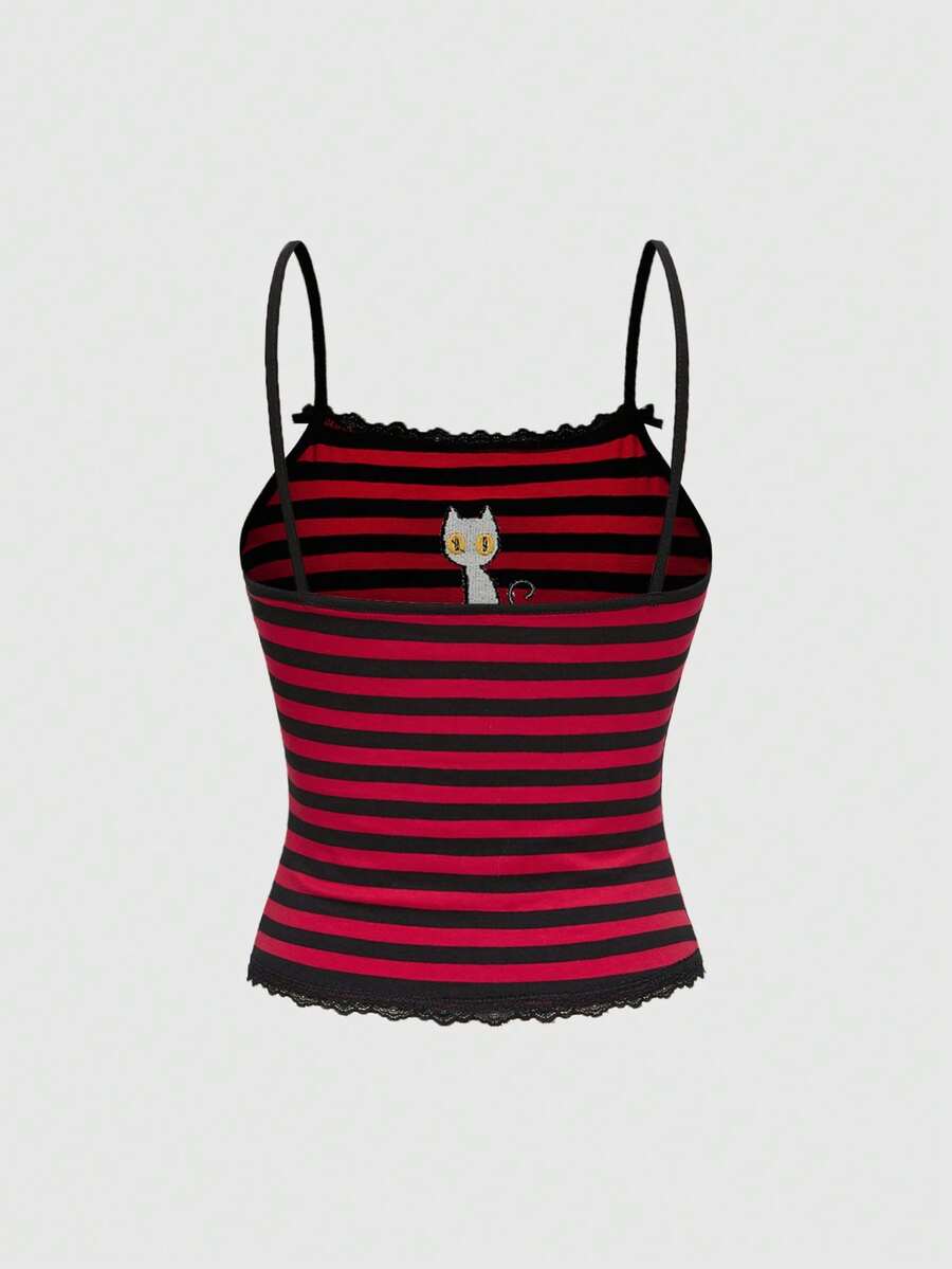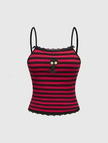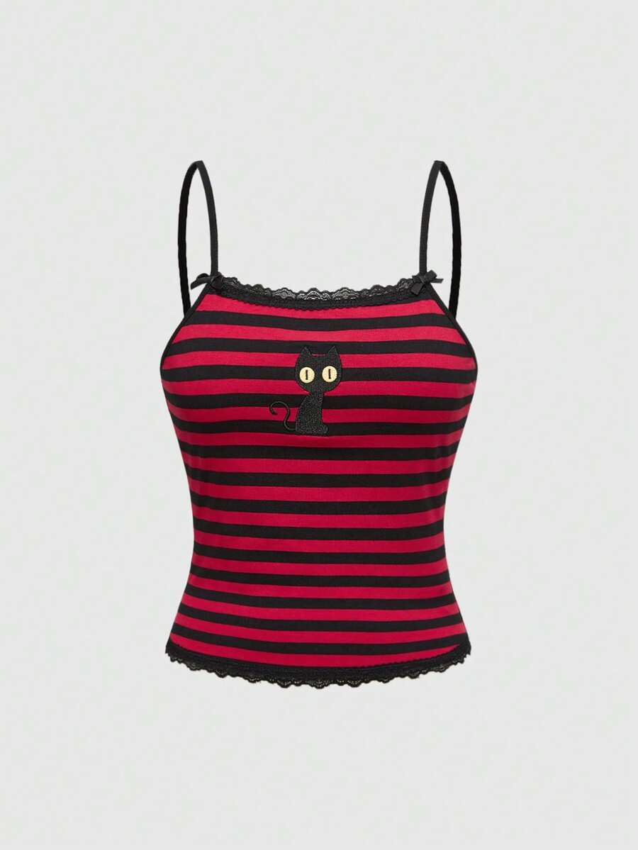Hippie Women's Gothic Style Black Cat & Striped Print Lace Trim Fitted Camisole Tank Top, Suitable For Summer & Halloween