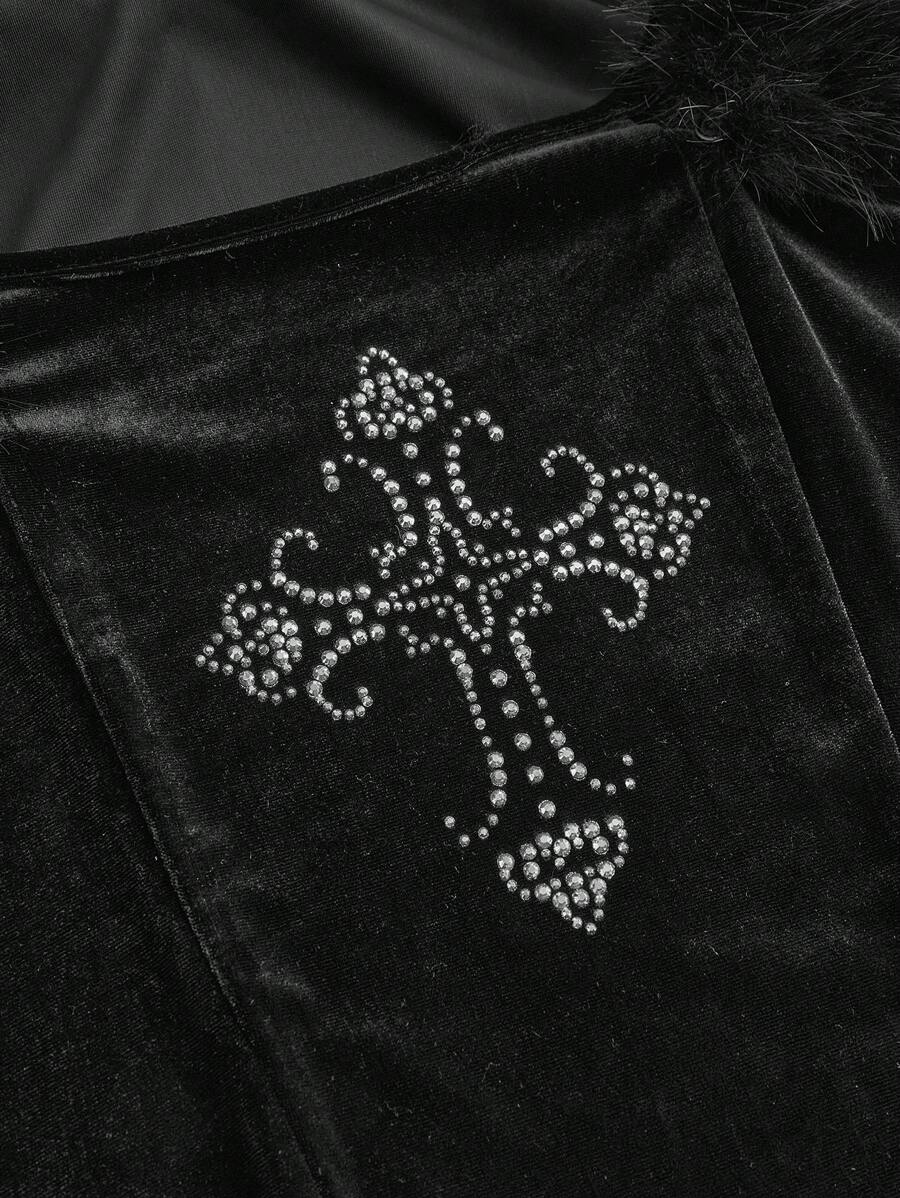 Women's Hippie Cross Rhinestone Velvet Patchwork Oversize T-Shirt With Fluffy Collar