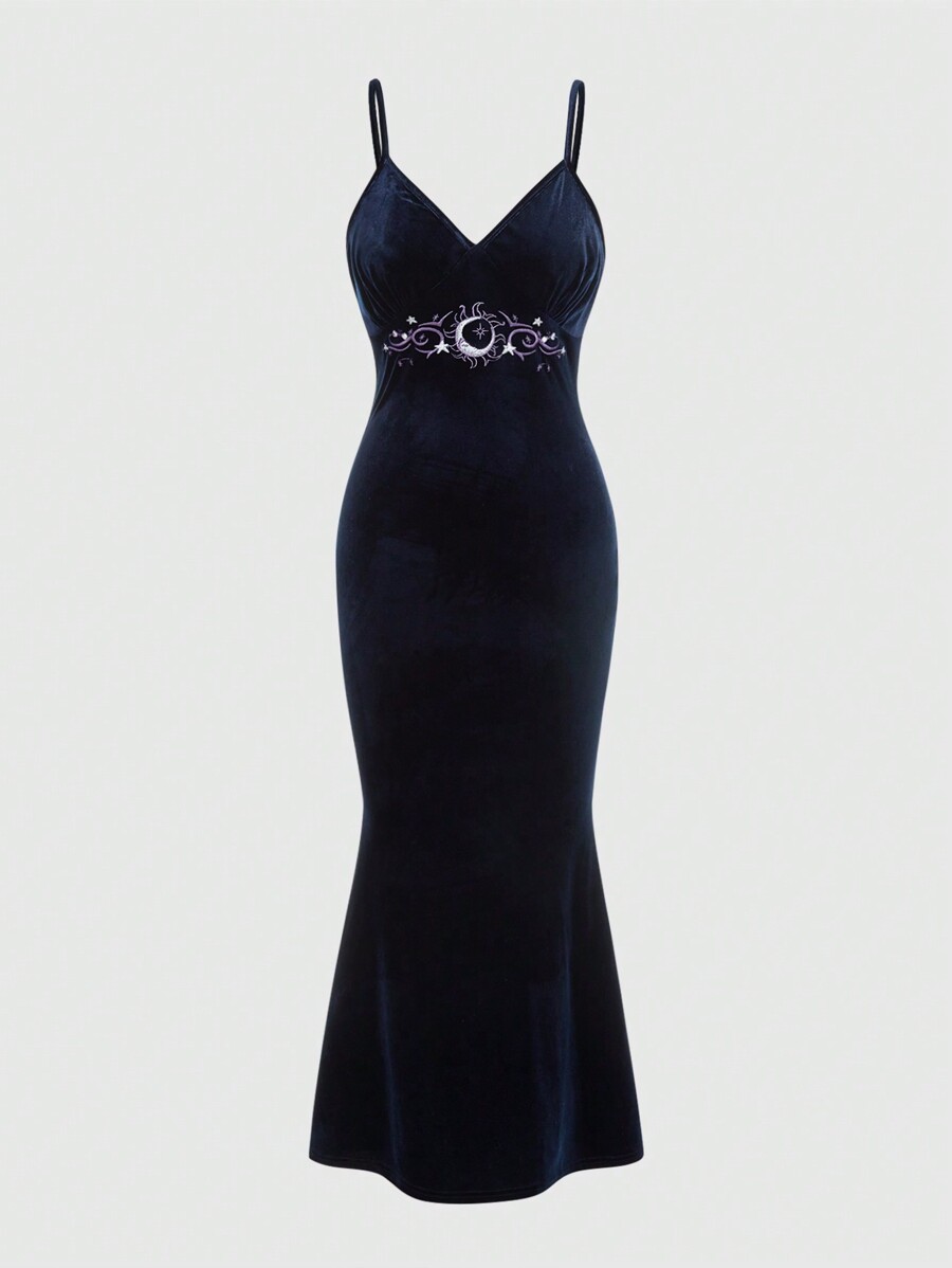 Hippie Women's Moon And Star Embroidered Mermaid Hem Spaghetti Strap Dress