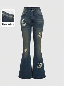 Hippie Women's Retro Washed Star & Moon Embroidery Slim Flare Leg Jeans