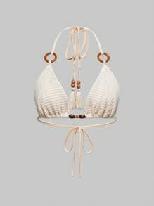Hippie Y2K Boho Style Wooden Bead Decor Backless Halter Neck Bikini Tank Top For Women