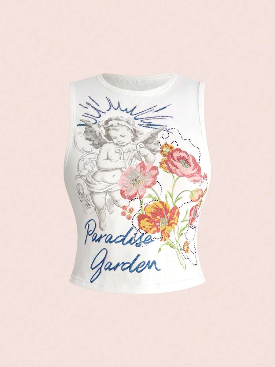 Island Babe Floral Angel English Print Rhinestone Embellished Women's Fitted T-Shirt
