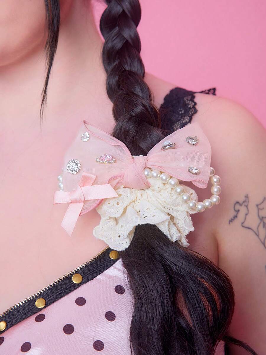 J-Fashion 1pc Korean Style Bling Rhinestone, Pearl & Tulle Bow Scrunchie, Cute & Elegant Hair Accessory Hair Tie Ponytail Holder Hair Elastic Hair Rope