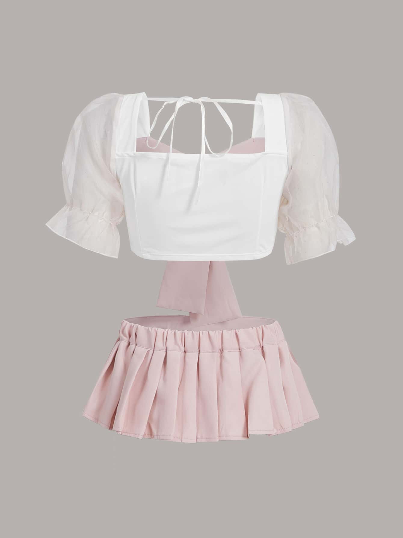 J-Fashion Contrast Mesh Bow Decor Pleated Lingerie Set