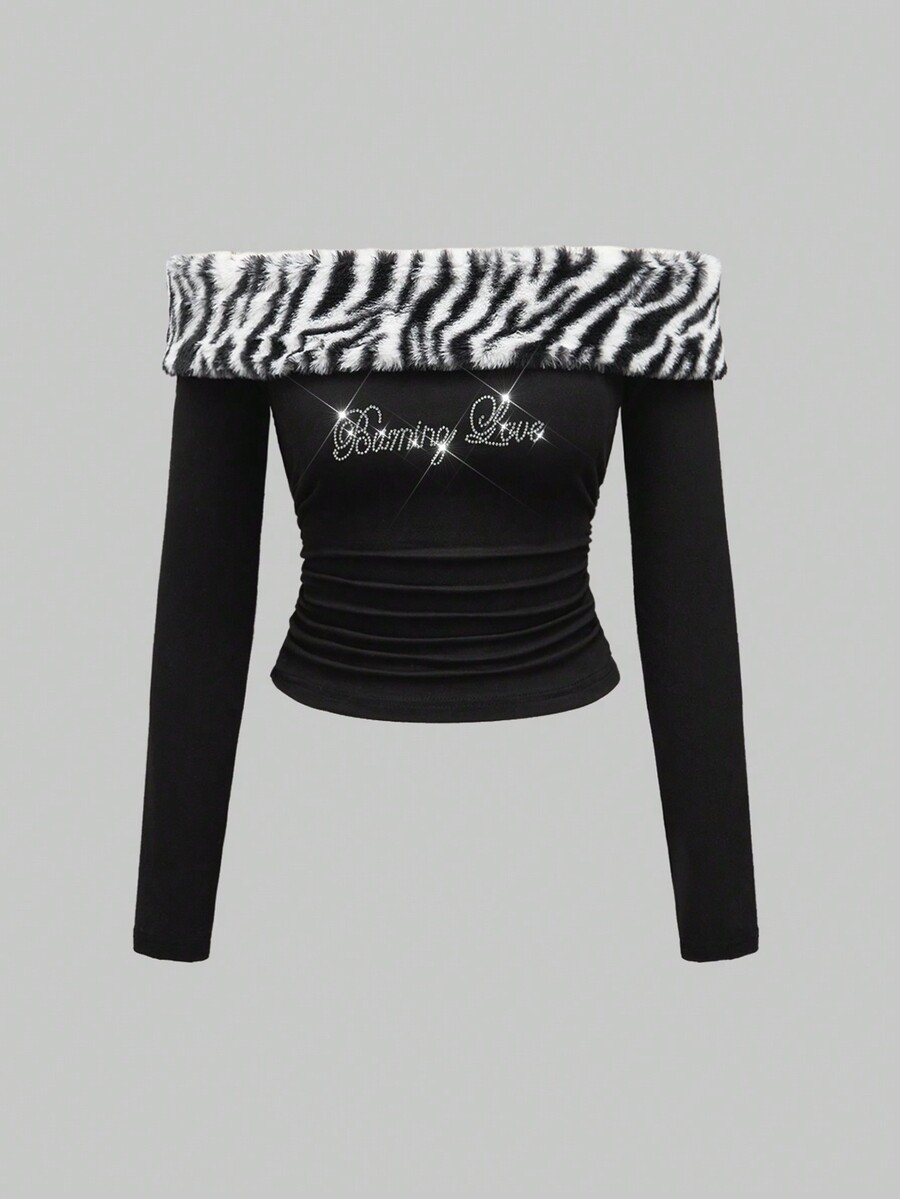 J-Fashion Shibuya Subculture Mohair Blend Zebra Pattern Patchwork Knit Black Fitted Women's Gyaru Off Shoulder Top