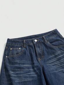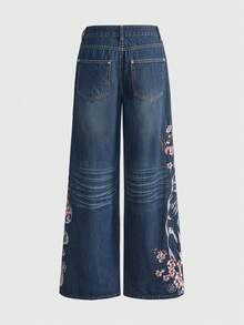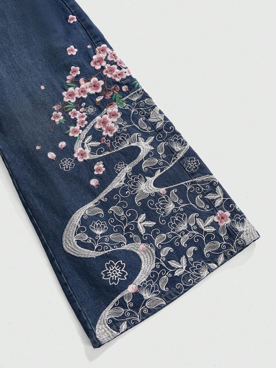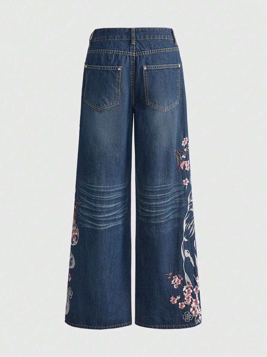 J-Fashion Unisex Retro Street-Style Chinese Tiger & Floral Embroidery Loose Wide-Leg Jeans