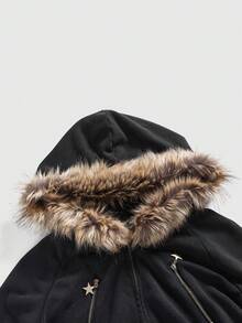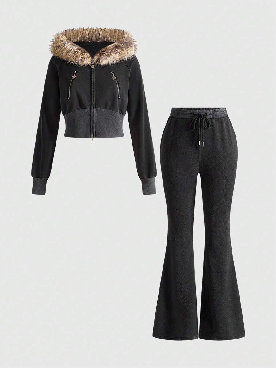 J-Fashion Vintage Zip-Up Distressed Furry Casual Two Pieces Set For Women, Autumn/Winter