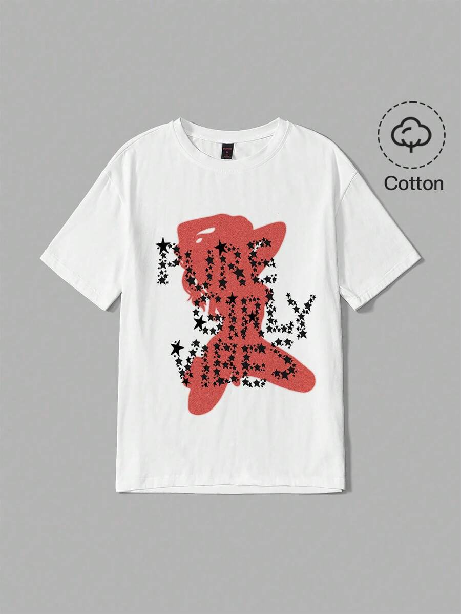 J-Fashion Women's Summer Casual Loose Graphic Slogan & Star Print T-Shirt, White/Black/Red
