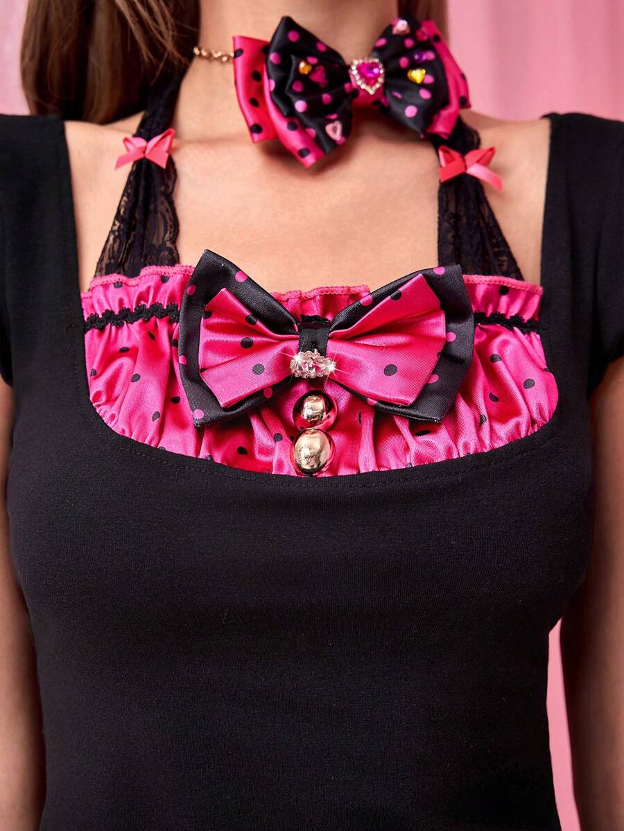 J-Fashion Y2K Abihimekaji Gyaru Style Polka Dot Lace Splice Oversized Bow Decor Fake 2 Pieces T-Shirt For Women